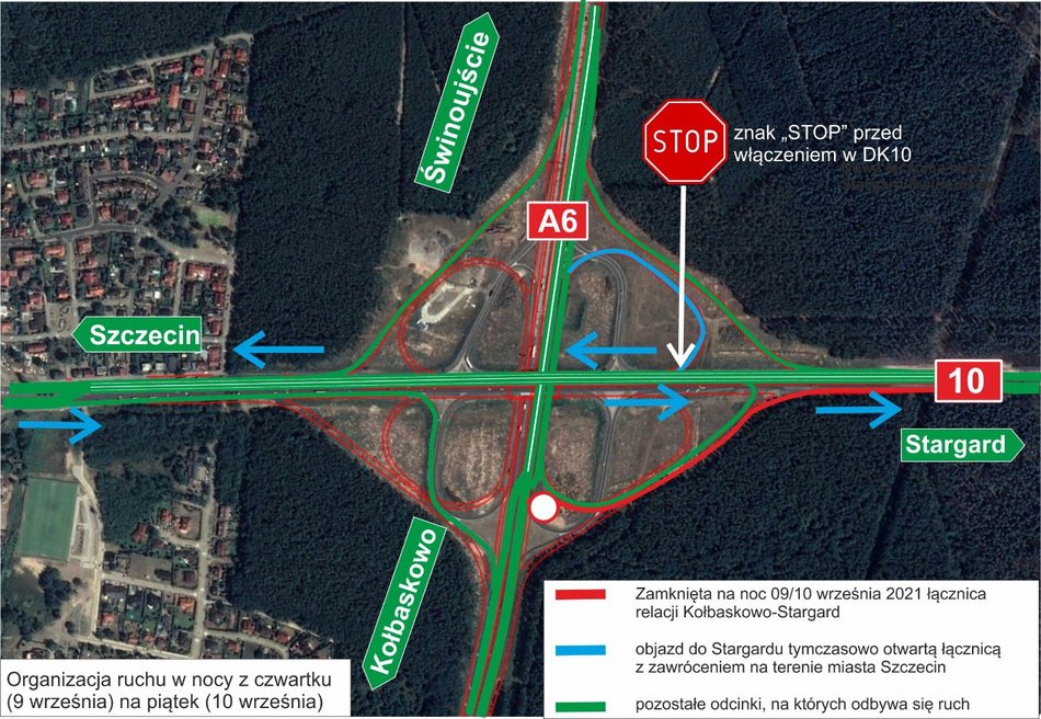 Na włączeniu łącznicy do drogi krajowej nr 10 postawiony zostanie znak „STOP”. Kierowcy powinni zachować szczególną ostrożność w tym miejscu. Pojazdy jadące w kierunku Stargardu będą musiały zawrócić na terenie Szczecina i kontynuować jazdę DK10.