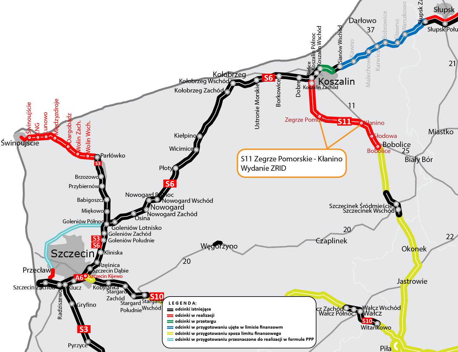 Wojewoda Zachodniopomorski wydał decyzję o zezwoleniu na realizację inwestycji drogowej (ZRID) dla ponad 19-kilometrowego odcinka drogi ekspresowej S11 Zegrze Pomorskie - Kłanino. Jest to drugi odcinek S11 od Koszalina do Bobolic z wydaną decyzją ZRID. Decyzja ta ma rygor natychmiastowej wykonalności i umożliwia rozpoczęcie robót budowlanych. Zakończenie inwestycji planowane jest na wrzesień 2023 r.