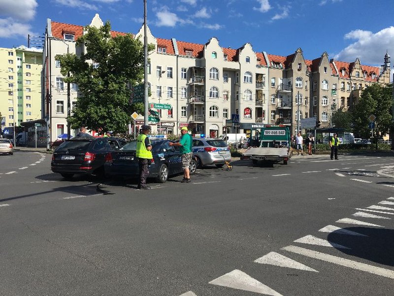Utrudnienia w ruchu na pl. Kościuszki w Szczecinie. Trwa tam usuwanie skutków zderzenia volvo i skody octavii.