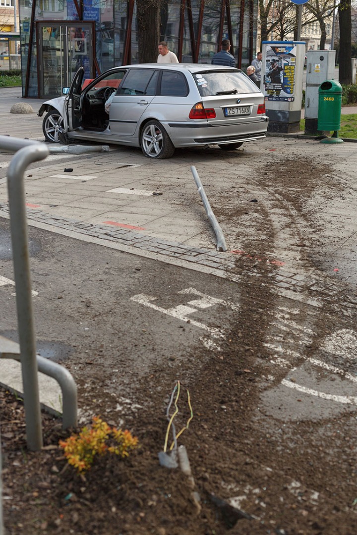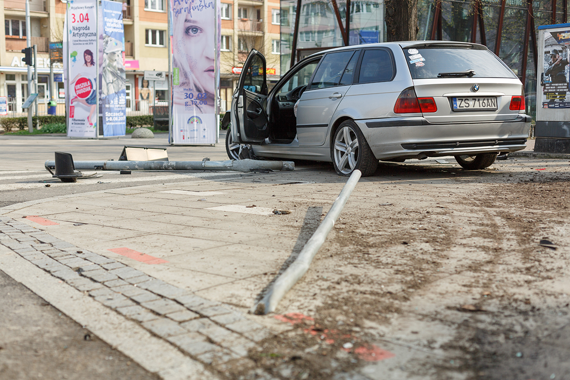 Policja, która ma nagranie, nie potwierdza udziału trzeciego auta w stłuczce na placu Żołnierza w Szczecinie, w której uczestniczyły dwa samochody. - bmw uderzyło w citroena i ścięło sygnalizację świetlą - mówi dyżurny Komendy Miejskiej Policji w Szczecinie. Do zdarzenia doszło w niedzielę przed południem. Bmw stoi na przejściu w okolicy tzw. szklanej pułapki.