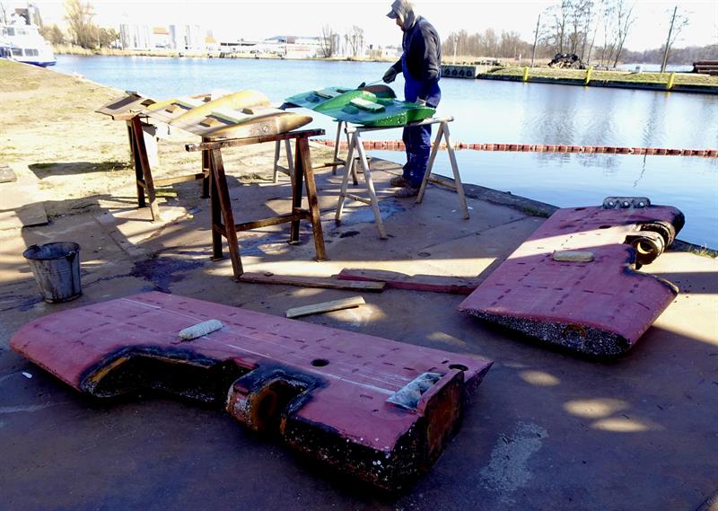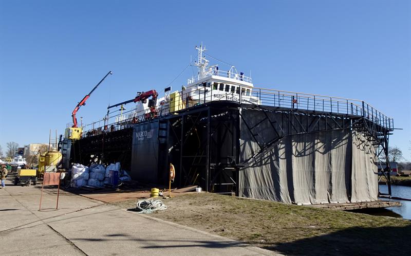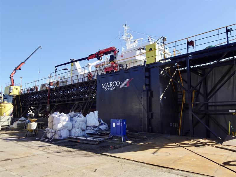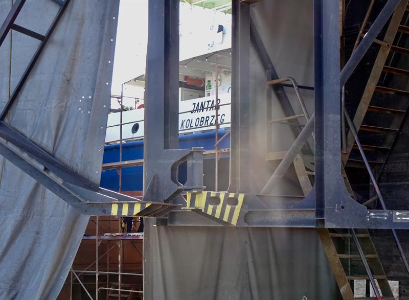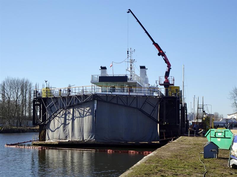 „Jantar” przechodzi przegląd w szczecińskiej stoczni Marco Service. Prace prowadzone są w najstarszym w Europie pływającym doku, w Basenie Cichym.