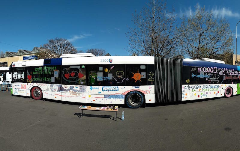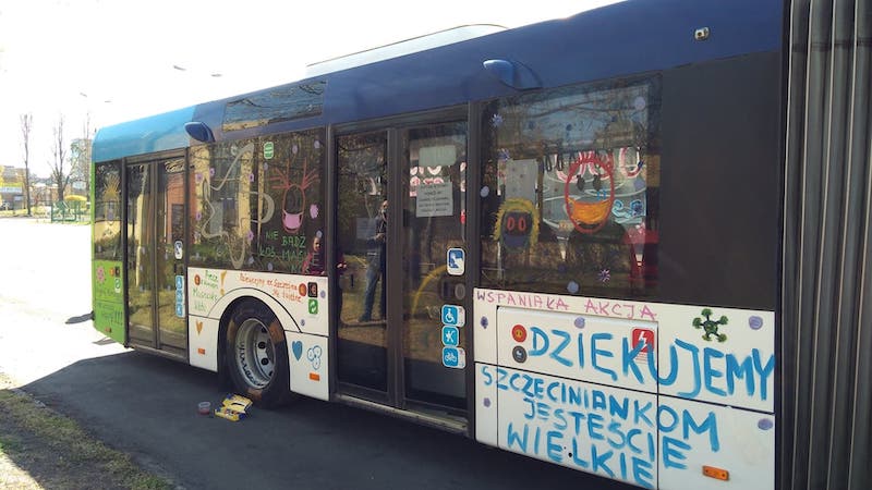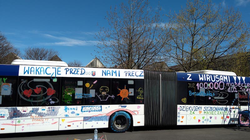 Kolorowy, wesoły autobus, pomalowany przez pracowników Szczecińskiego Przedsiębiorstwa Autobusowego "Dąbie" wyjedzie w piątek po południu na trasę linii B. To podziękowanie dla grupy Szczecinianki szyją maseczki.