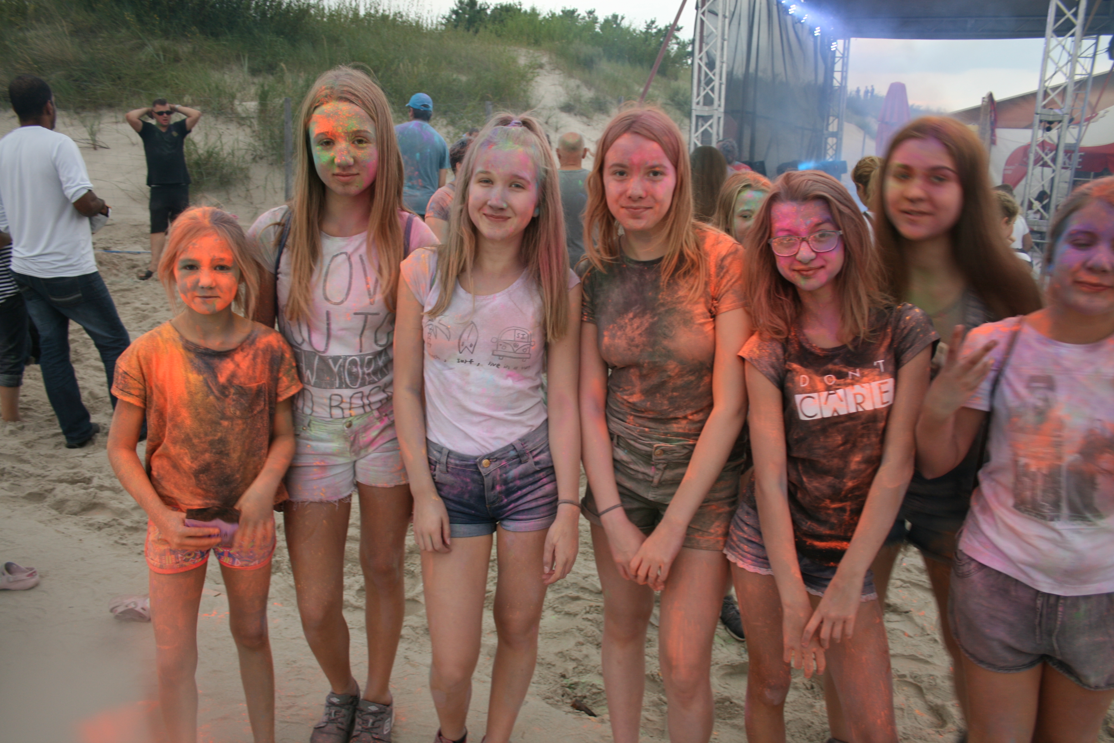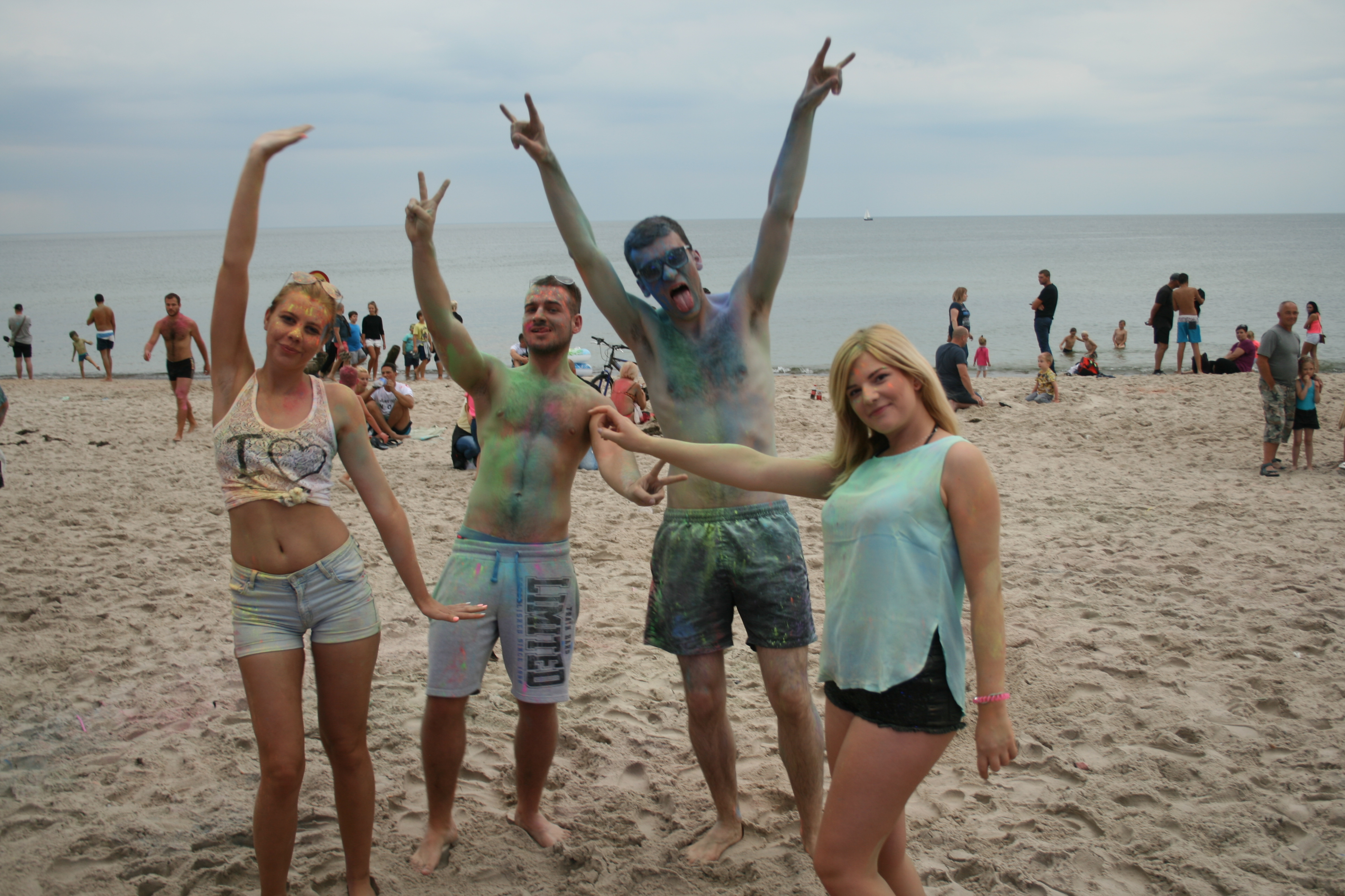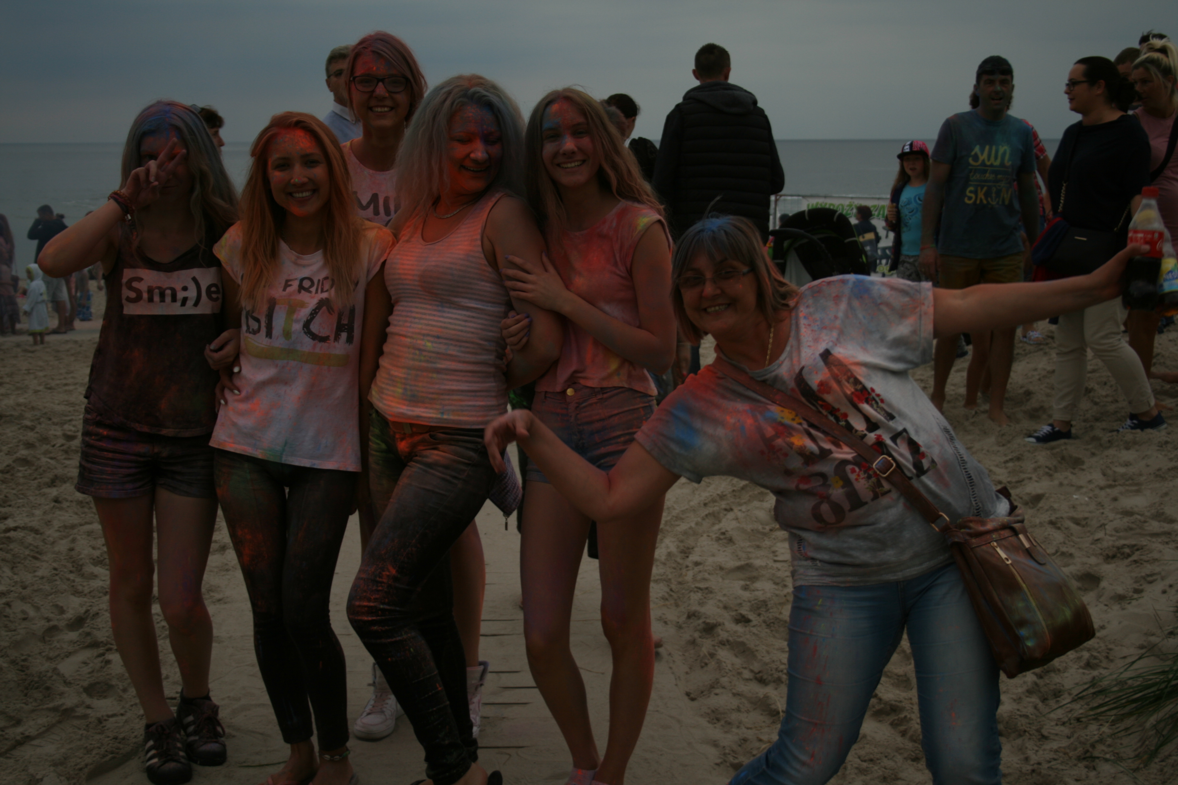 Wspaniała zabawa odbyła się w sobotę na plaży w Dziwnowie. Przy dźwiękach muzyki granej przez didżeja uczestnicy, w głównie uczestniczki, posypywali się kolorowymi proszkami, które zmieniały kolor włosów, twarzy i ubrań. Najlepszy efekt dawały kolory jaskrawe - żółty i pomarańczowy.