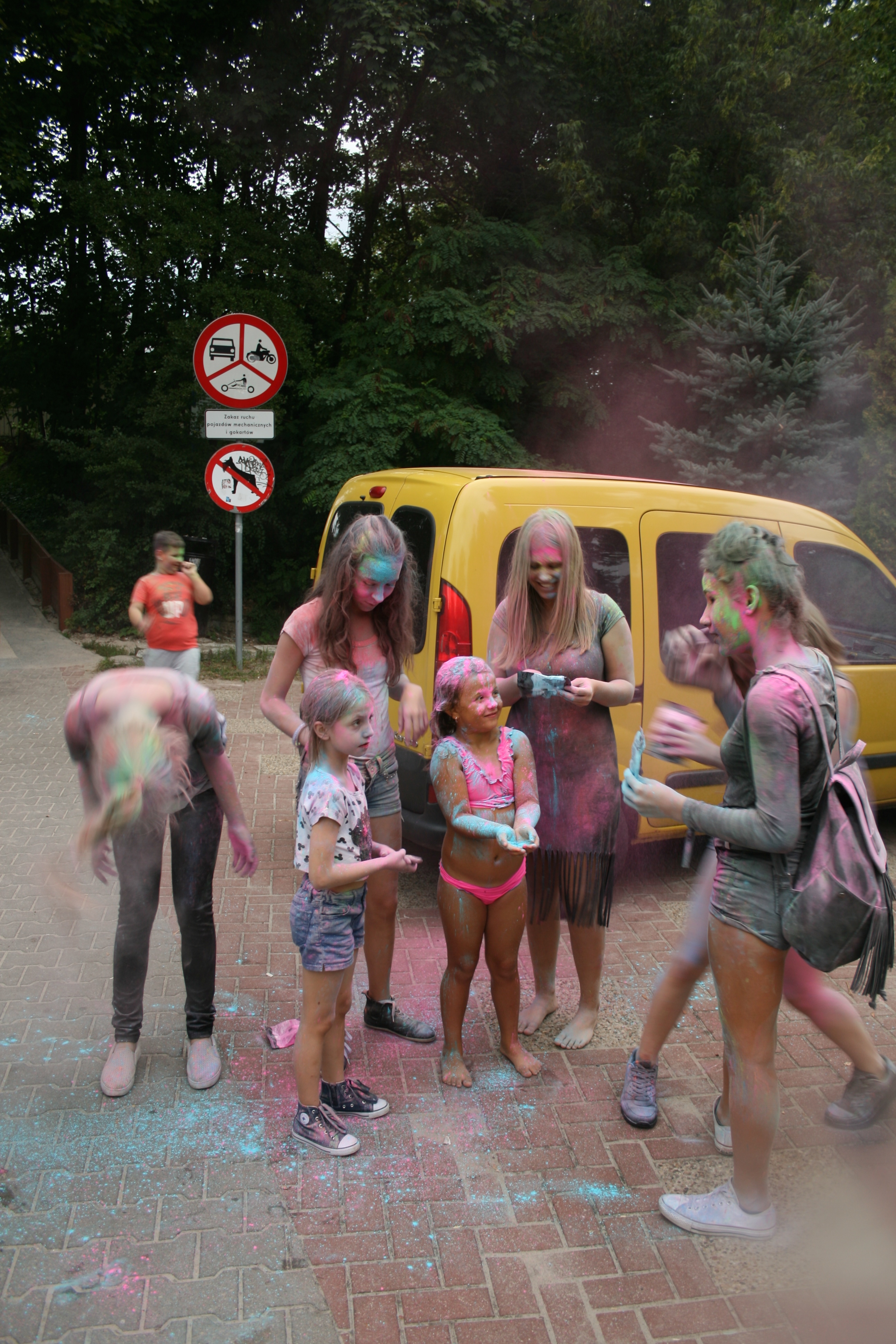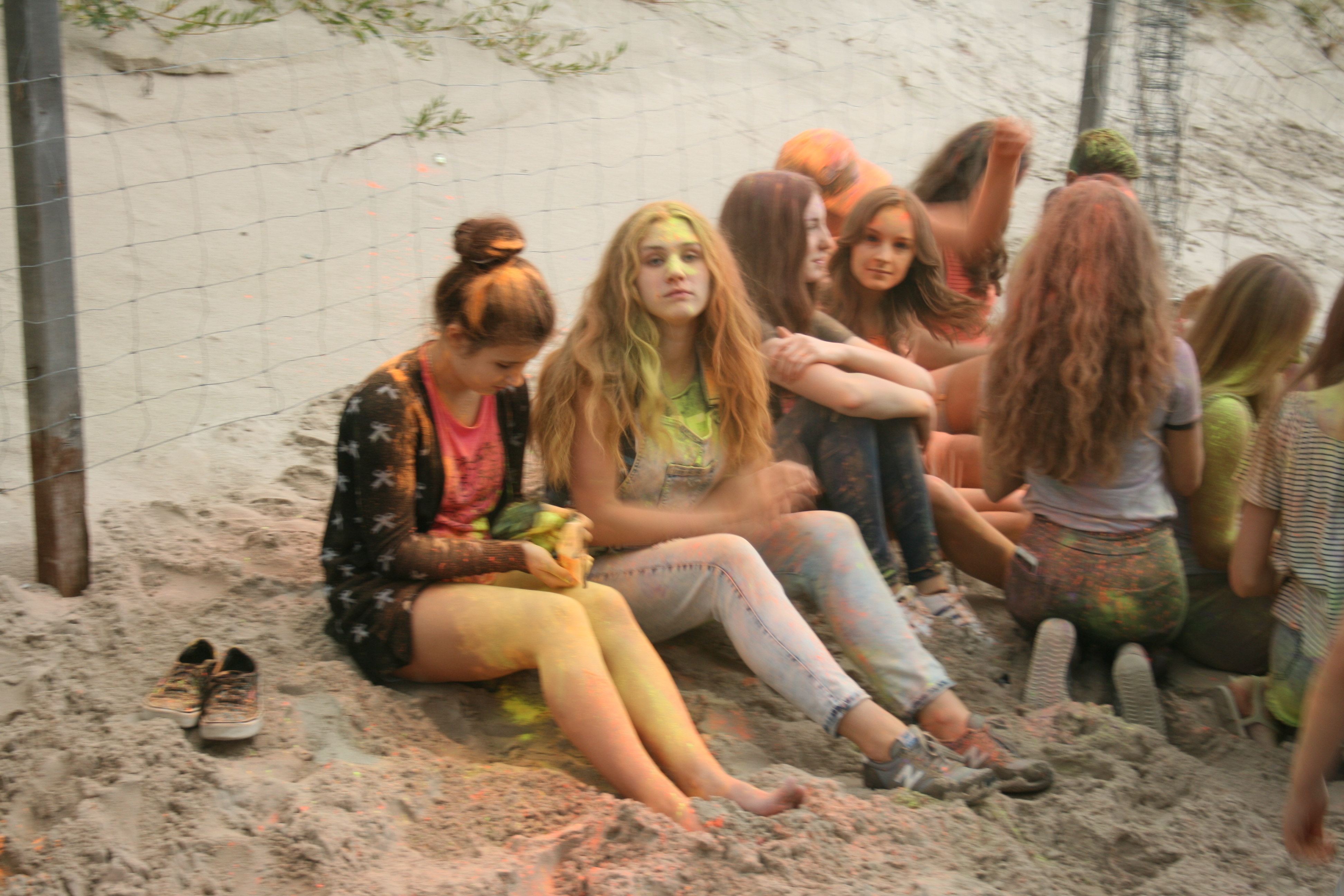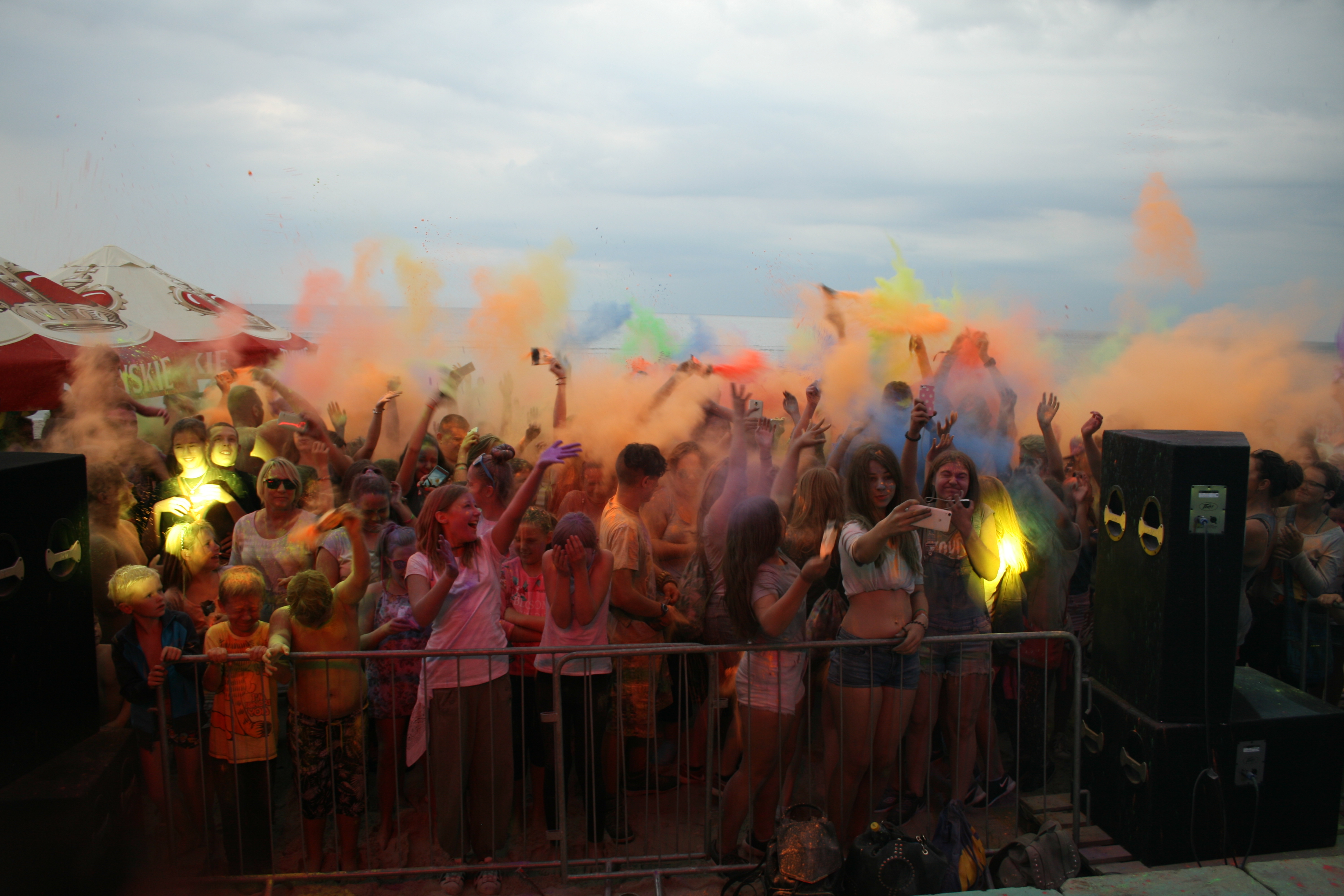 Wspaniała zabawa odbyła się w sobotę na plaży w Dziwnowie. Przy dźwiękach muzyki granej przez didżeja uczestnicy, w głównie uczestniczki, posypywali się kolorowymi proszkami, które zmieniały kolor włosów, twarzy i ubrań. Najlepszy efekt dawały kolory jaskrawe - żółty i pomarańczowy.