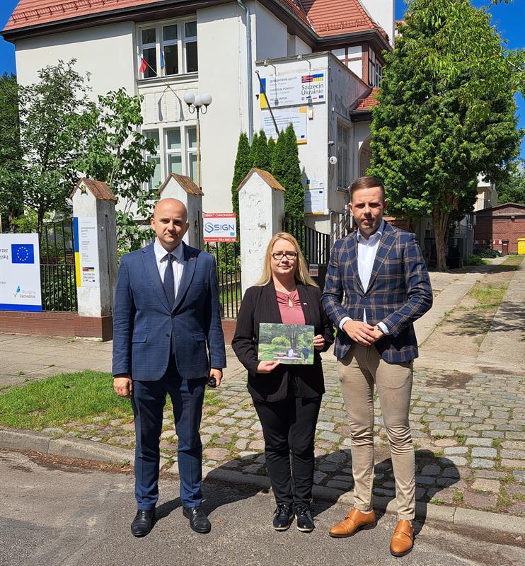Politycy PiS. Dariusz Matecki, Agnieszka Kurzawa i Rafał Niburski podczas konferencji prasowej na ul. Marii Skłodowskiej-Curie w Szczecinie, gdzie powstać ma Centrum Integracji Cudzoziemców.