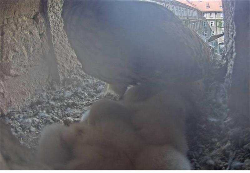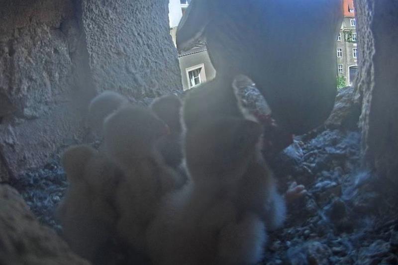 Natomiast za dwa tygodnie w aprowizacji będzie musiała pomóc samica. Żarłoczne młode będą bowiem rosły jak na drożdżach, by po zaledwie trzech tygodniach osiągnąć rozmiary swych rodziców. To wtedy zacznie się najbardziej emocjonujący etap „Big Brothera wśród piór" z ich udziałem. Młode zaczną bowiem zwiedzać okolice, czyli zabawnie bujać się na krótkich nóżkach: spacerując i biegając po gzymsie „szpinakowego pałacu". Będzie można podpatrywać, jak prostują ostre szpony i skrzydła, jak czyszczą piórka, a też jak zaglądają w okna urzędników magistratu.