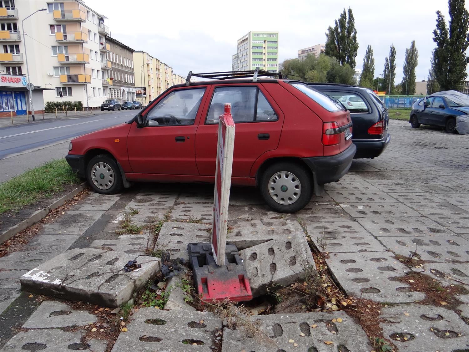 Opodal pętli tramwajowej na Pomorzanach, a tuż przy miejscowym rynku, jest spory parking. Może dlatego, że znajduje się przy ul. Budziszyńskiej, a nie na pl. Rodła, miejskie służby „starannie" nie zauważają, że od miesięcy jedno z miejsc parkingowych zajmuje wrak samochodu, a od tygodni - na drugim - stale się pogłębia dziura w nawierzchni: niebezpieczna, bo mimo ostrzegawczego znaku, sięgająca na ponad metr głębokości. ©℗