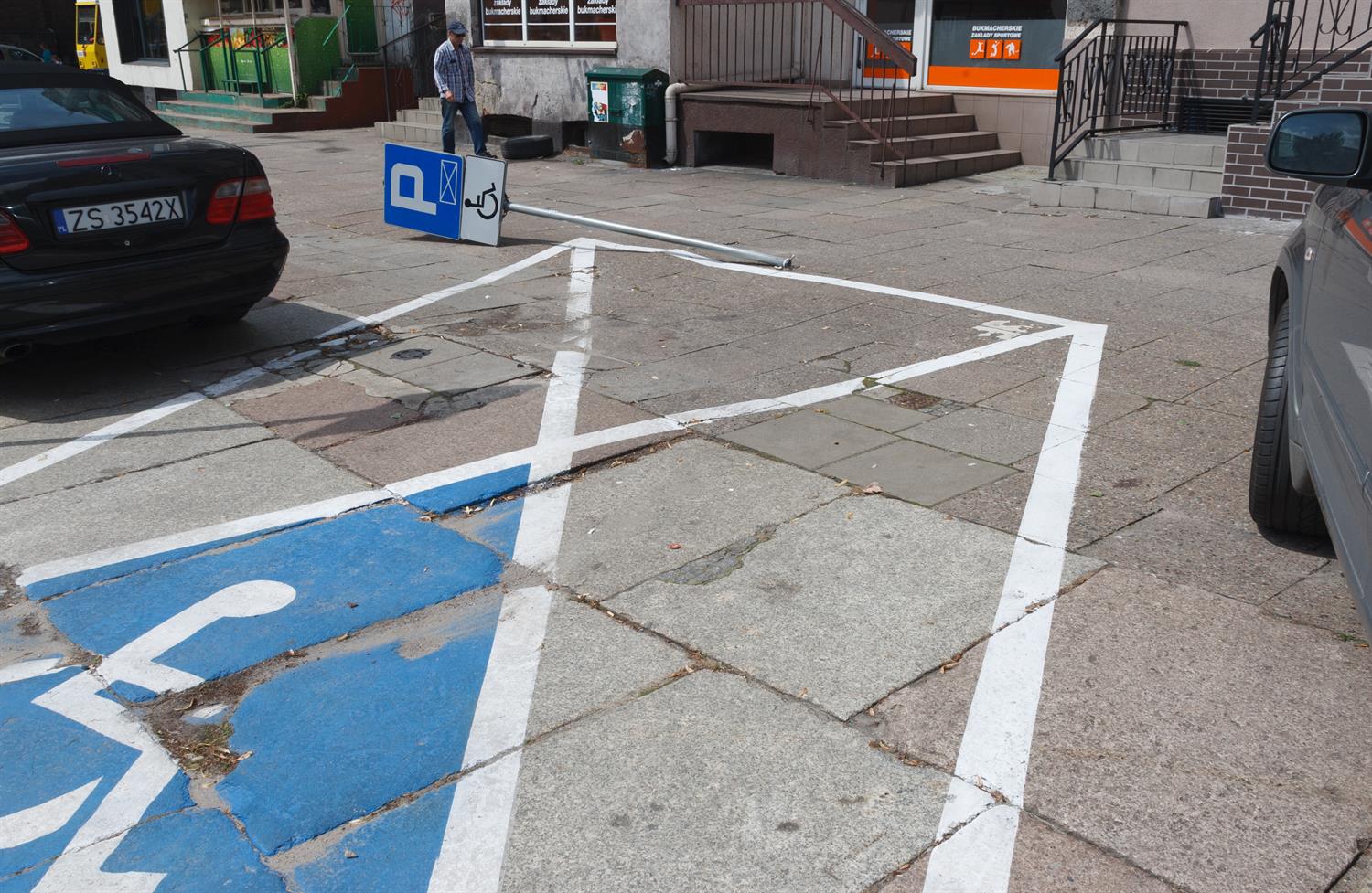 Przewrócony znak drogowy leży przy zbiegu ulicy Jagiellońskiej z al. Piastów w Szczecinie. I to akurat oznaczający miejsce parkingowe dla osób niepełnosprawnych. Tych w mieście i tak jest za mało. Ciekawe komu tak bardzo ten znak przeszkadzał. Na szczęście oznaczenia poziomego już tak łatwo usunąć się nie da. Liczymy, że służby miejskie zadbają, aby słupek szybko trafił na właściwe miejsce.