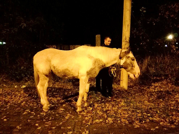Policjanci w nocy zaopiekowali się koniem, który samotnie wyruszył w miasto i zgubił drogę do domu. Zmęczone po przeżytych przygodach zwierzę pozwoliło zawieźć się do stajni, gdzie zjadło siano i spokojnie czekało na swoich właścicieli.