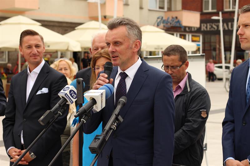 Na placu Wolności, który – jak podkreślała radna Elżbieta Jabłońska – ze względu na nazwę nie został wybrany przypadkowo na miejsce konferencji, zebrało się piętnastu działaczy: reprezentantów PO oraz świnoujskiejNowoczesnej. Oprócz lokalnych polityków byli także marszałek Olgierd Geblewicz oraz poseł PO Arkadiusz Marchewka. Wraz z radną E. Jabłońską wspomniani oficjele chwalili kandydaturę D. Śliwińskiego, wspominając m.in., że jako prezes uzdrowiska ma „kompetencje zarządcze” i że „na motocyklu zjeździł cały kraj, a jak trzeba, to pojedzie i do Brukseli”.
