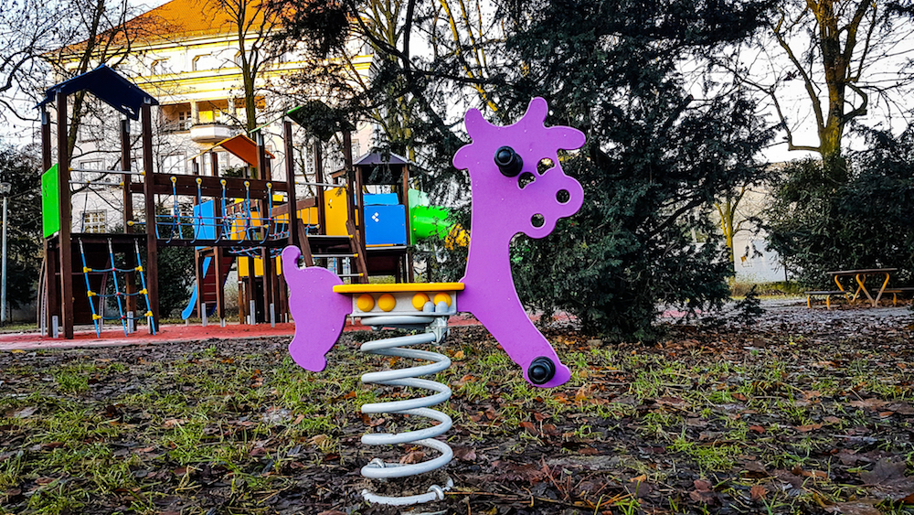 W piątym etapie ustawione zostały place zabaw. Znajdują się na nich urządzenia zarówno dla większych jak i małych dzieci. Są zjeżdżalnie, ślizgi rurowe, most, kładka czy tunel linowy. Najmłodsi skorzystają z huśtawek sprężynowych czy zabawki w kształcie samochodu. Urządzenia ustawione są na bezpiecznej nawierzchni. Tuż obok rodzice mogą poczekać na pociechy na ławkach parkowych, które ustawione zostały przy nowych, brukowanych alejkach.