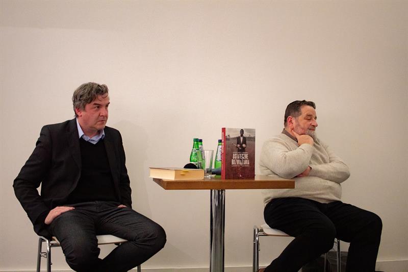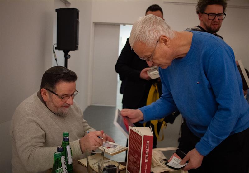 W trakcie rozmowy w Radosławem Ptaszyńskim Konstanty Gebert (w głębi, z prawej) opowiedział między innymi o tym, jak pracował nad swoją książką.