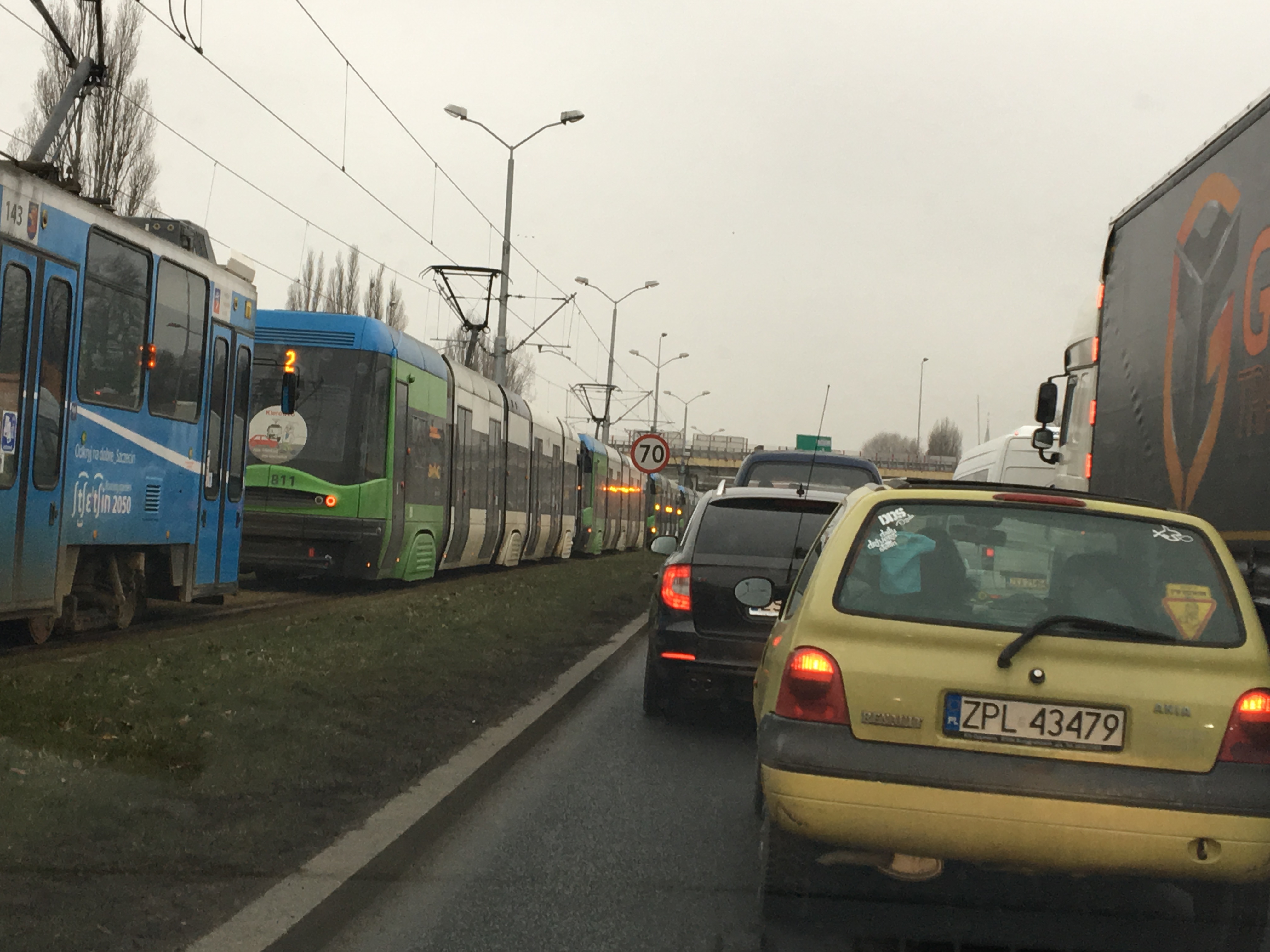 Na ul. Gdańskiej w kierunku wjazdu do Śródmieścia tworzą się olbrzymie korki. Zablokowany został też ruch tramwajów pomiędzy Basenem Górniczym a ul. Wyszyńskiego. Zarząd Dróg i Transportu Miejskiego w Szczecinie uruchomił na tym odcinku autobusową komunikację zastępczą. (k)