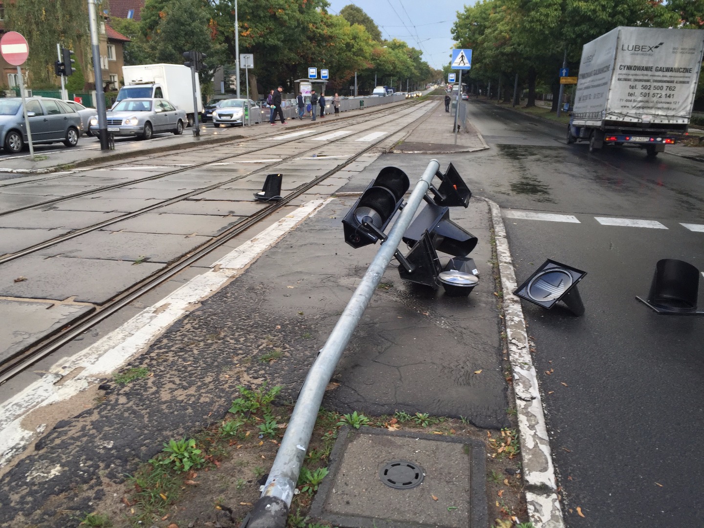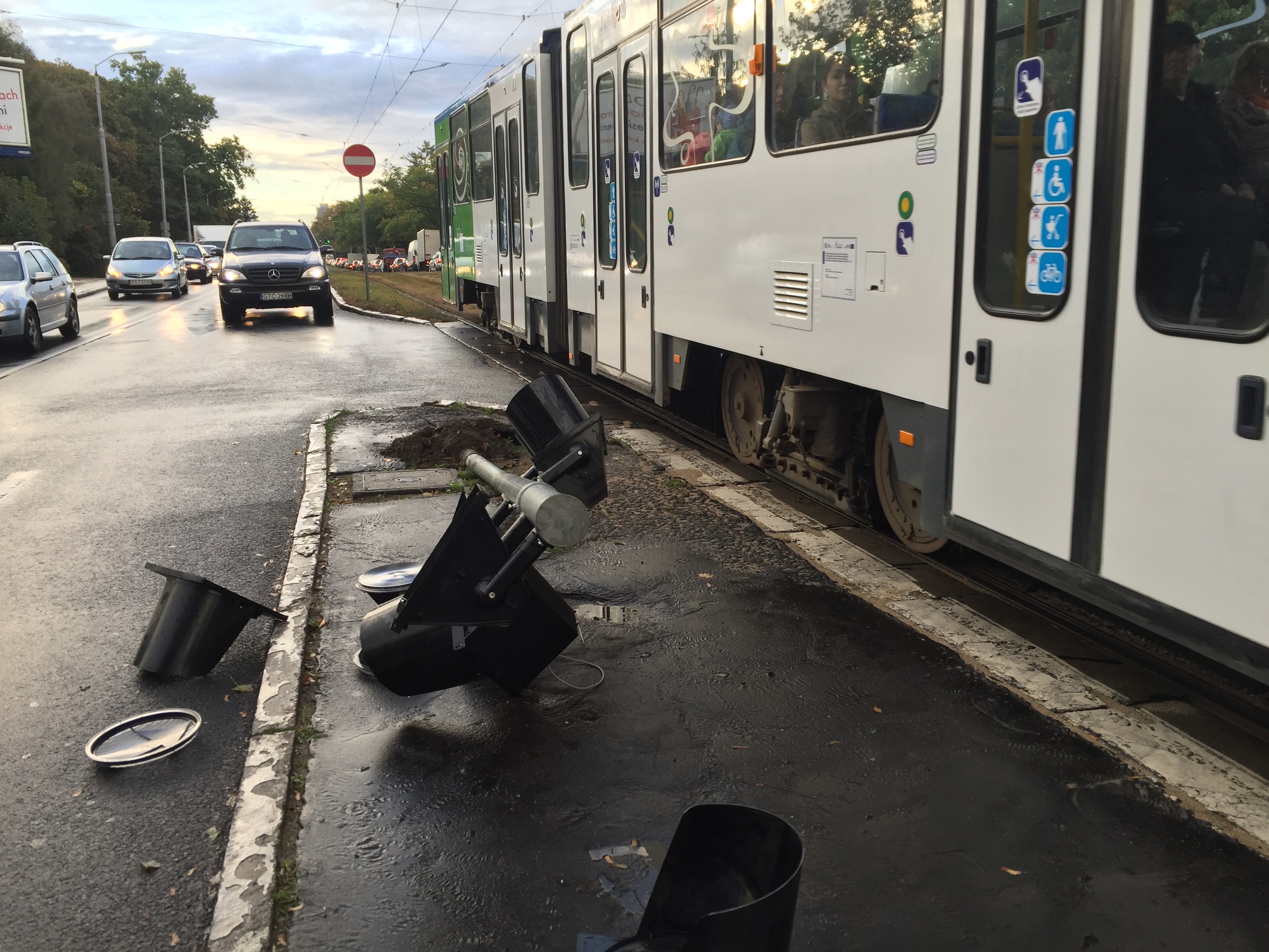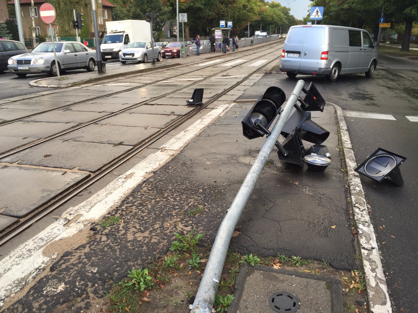 A sygnalizacja świetlna nie działa po tym, jak nieznany sprawca „skasował" słup sygnalizacji na wysepce od strony lewoskrętu z al. Wojska Polskiego w ul. Traugutta.. Części zdemolowanego sygnalizatora zalegają na lewym pasie jezdni w kierunku Głębokiego. Walały się też na torowisku przez jakiś czas, będąc przeszkodą w swobodnym przejeździe dla tramwajów.