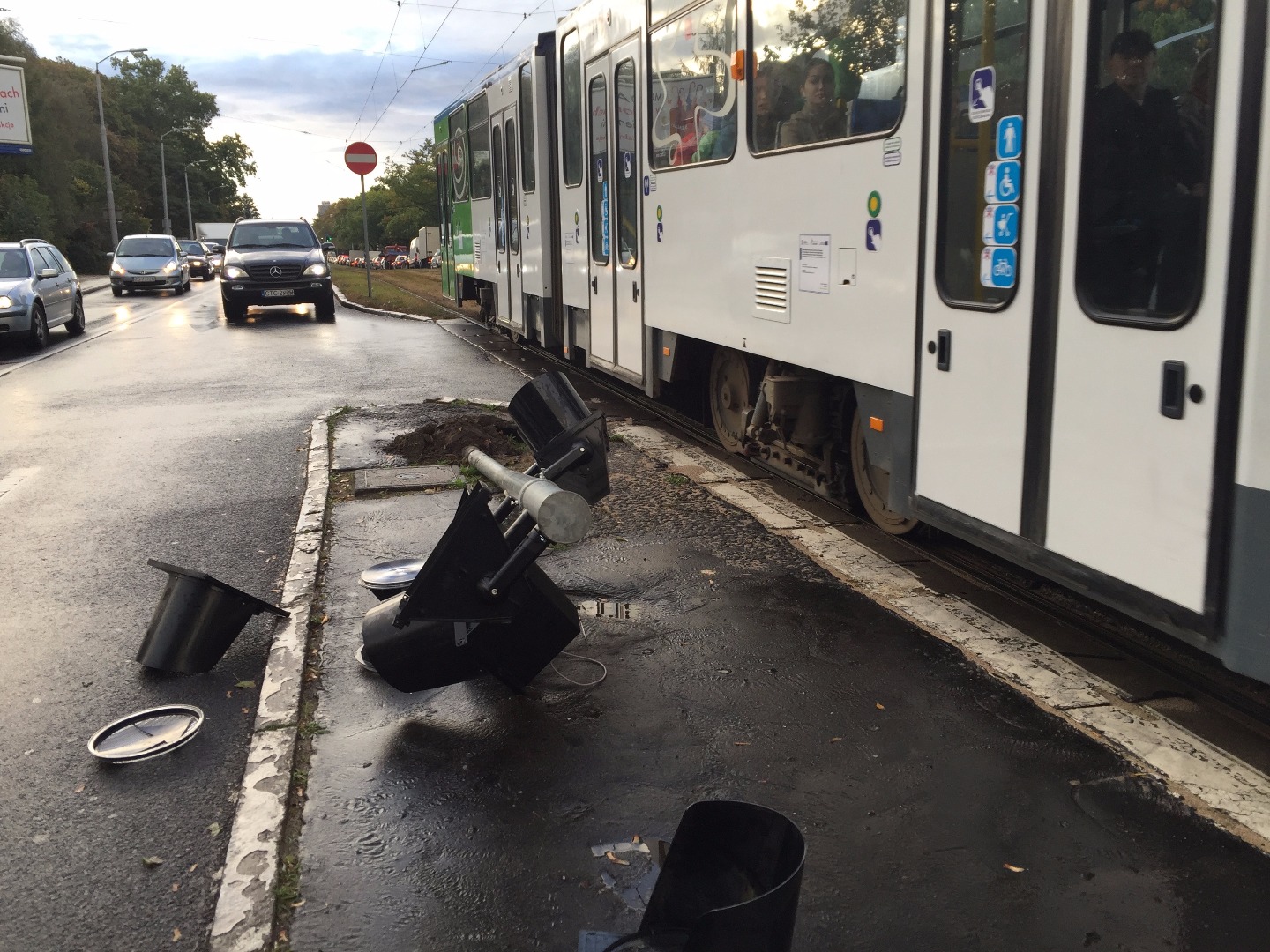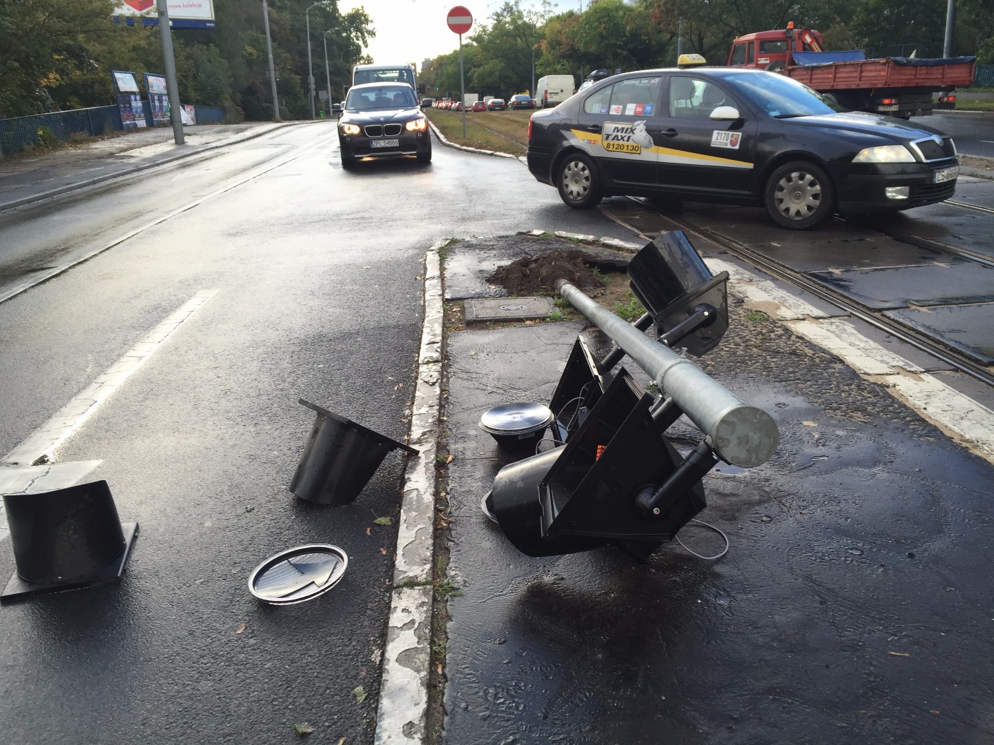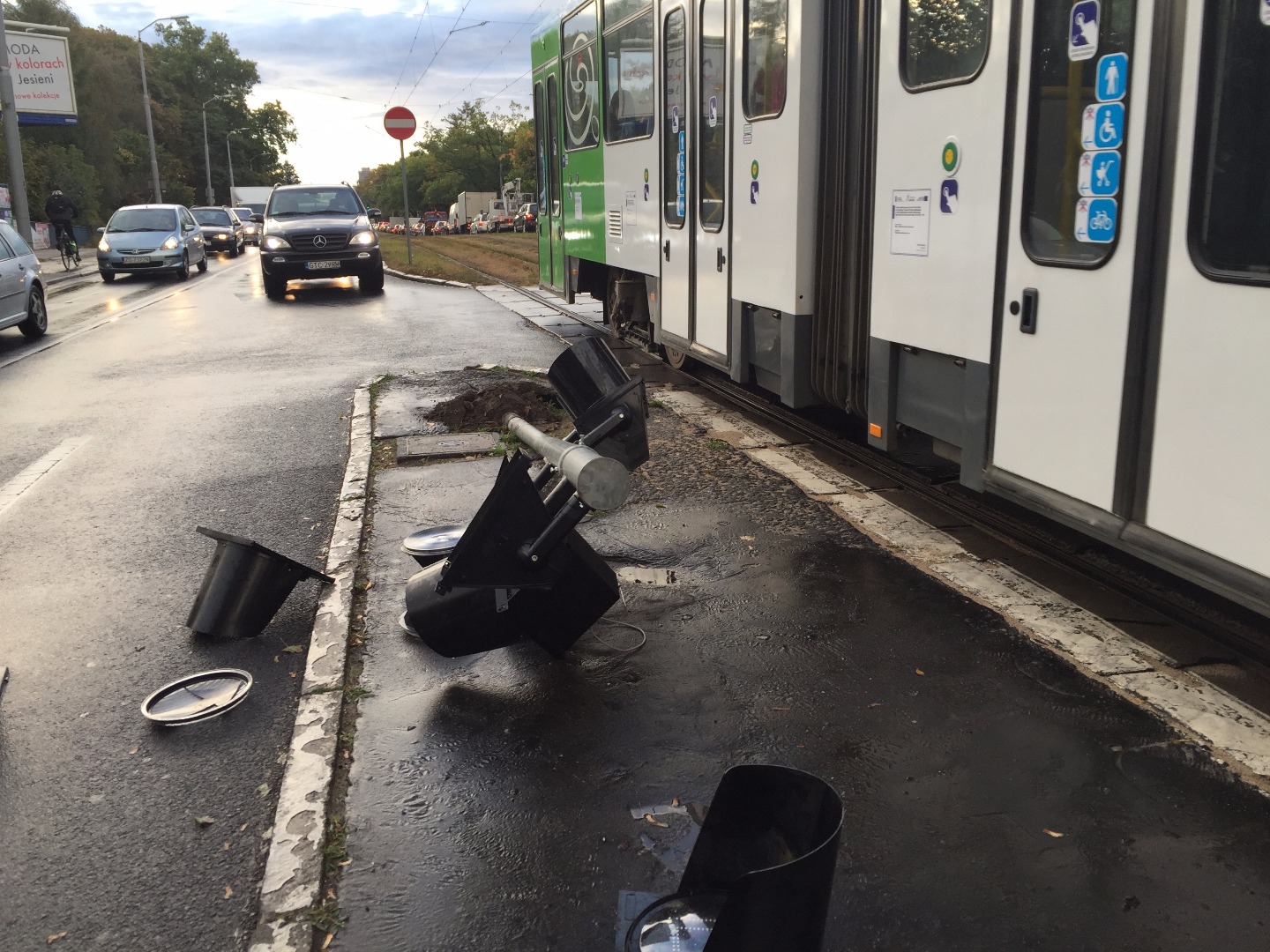 A sygnalizacja świetlna nie działa po tym, jak nieznany sprawca „skasował" słup sygnalizacji na wysepce od strony lewoskrętu z al. Wojska Polskiego w ul. Traugutta.. Części zdemolowanego sygnalizatora zalegają na lewym pasie jezdni w kierunku Głębokiego. Walały się też na torowisku przez jakiś czas, będąc przeszkodą w swobodnym przejeździe dla tramwajów.