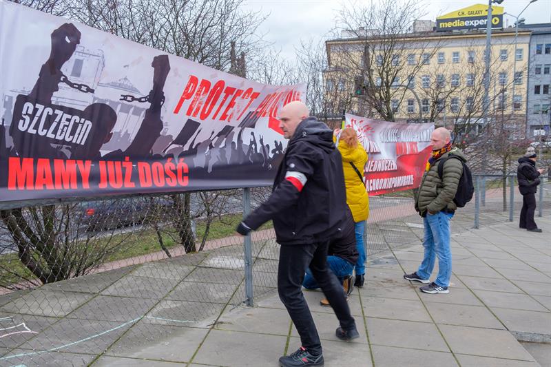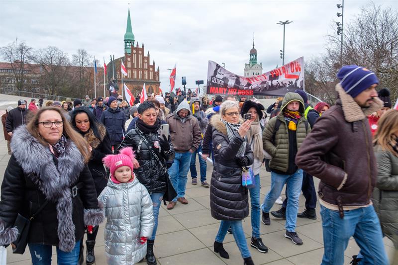 "Nie dla traktatu WHO!" - to jedno z haseł, jakie na transparentach mieli koronasceptycy, którzy wiecowali w niedzielę na placu Solidarności w Szczecinie.