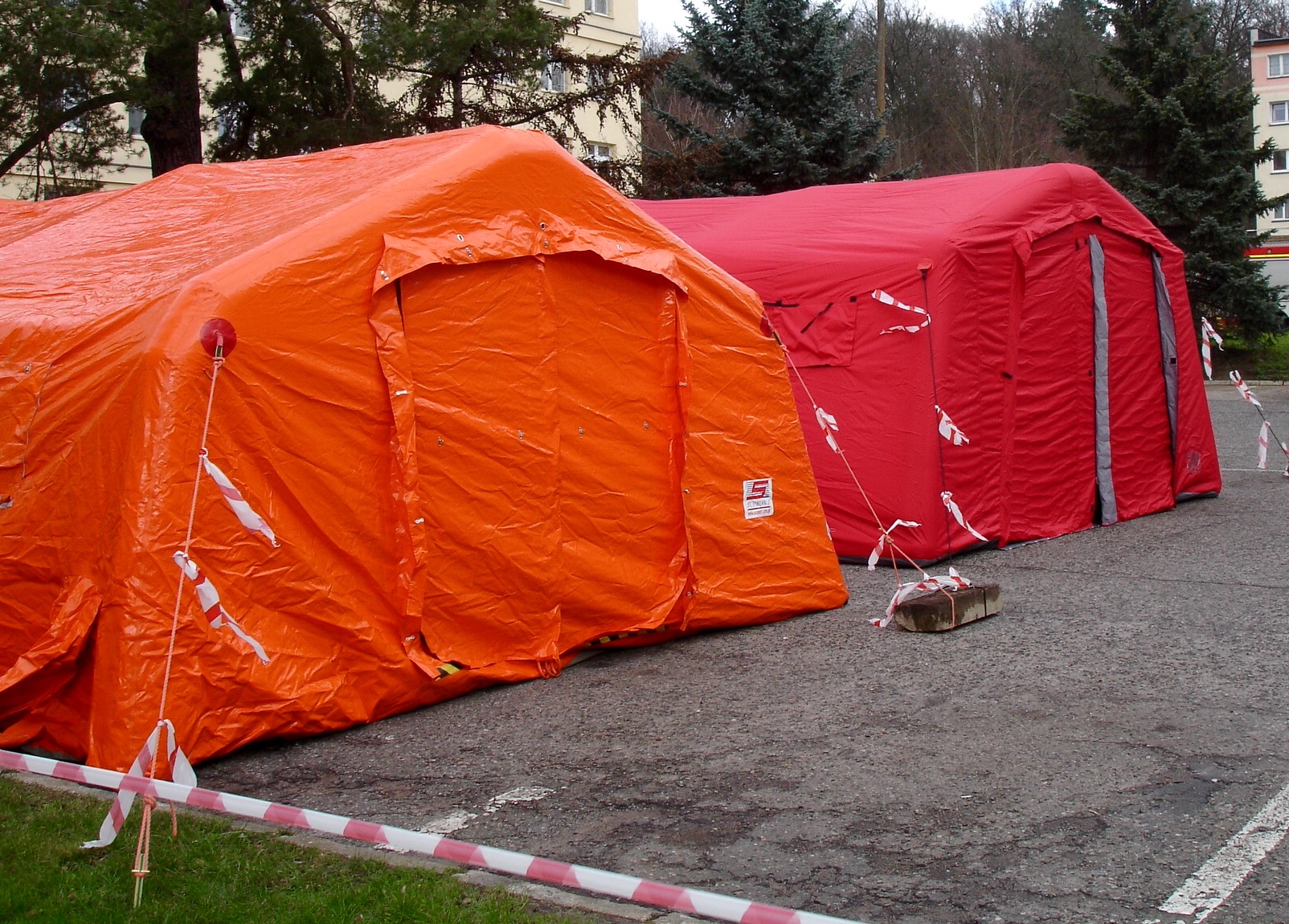 Na zdjęciu: Stojące na parkingu szpitalnym namioty w stanie gotowości z powodu pandemii mają pełnić rolę mobilnych izb przyjęć.