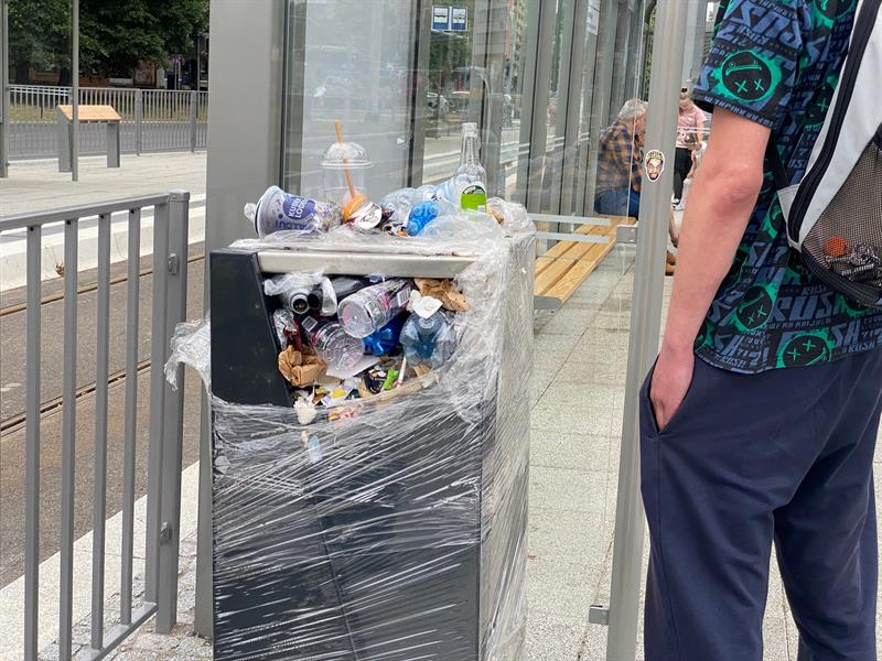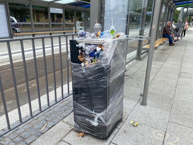 Wracamy do tematu przepełnionych koszy na śmieci w al. Wyzwolenia w Szczecinie. Po wznowieniu ruchu tramwajów pasażerom udostępniono także nowe przystanki wyposażone w kosze na śmieci. Niestety, są one zafoliowane, ale wiele osób próbuje upchnąć swoje odpadki w szczelinach folii. W efekcie nowe przystanki toną w śmieciach nie tylko dlatego, że nie każdy odpad trafia do kosza. Także dlatego, że nikt ich jeszcze nie opróżnia. I nie wiadomo, jak długo taki stan potrwa.