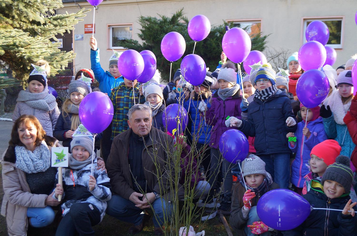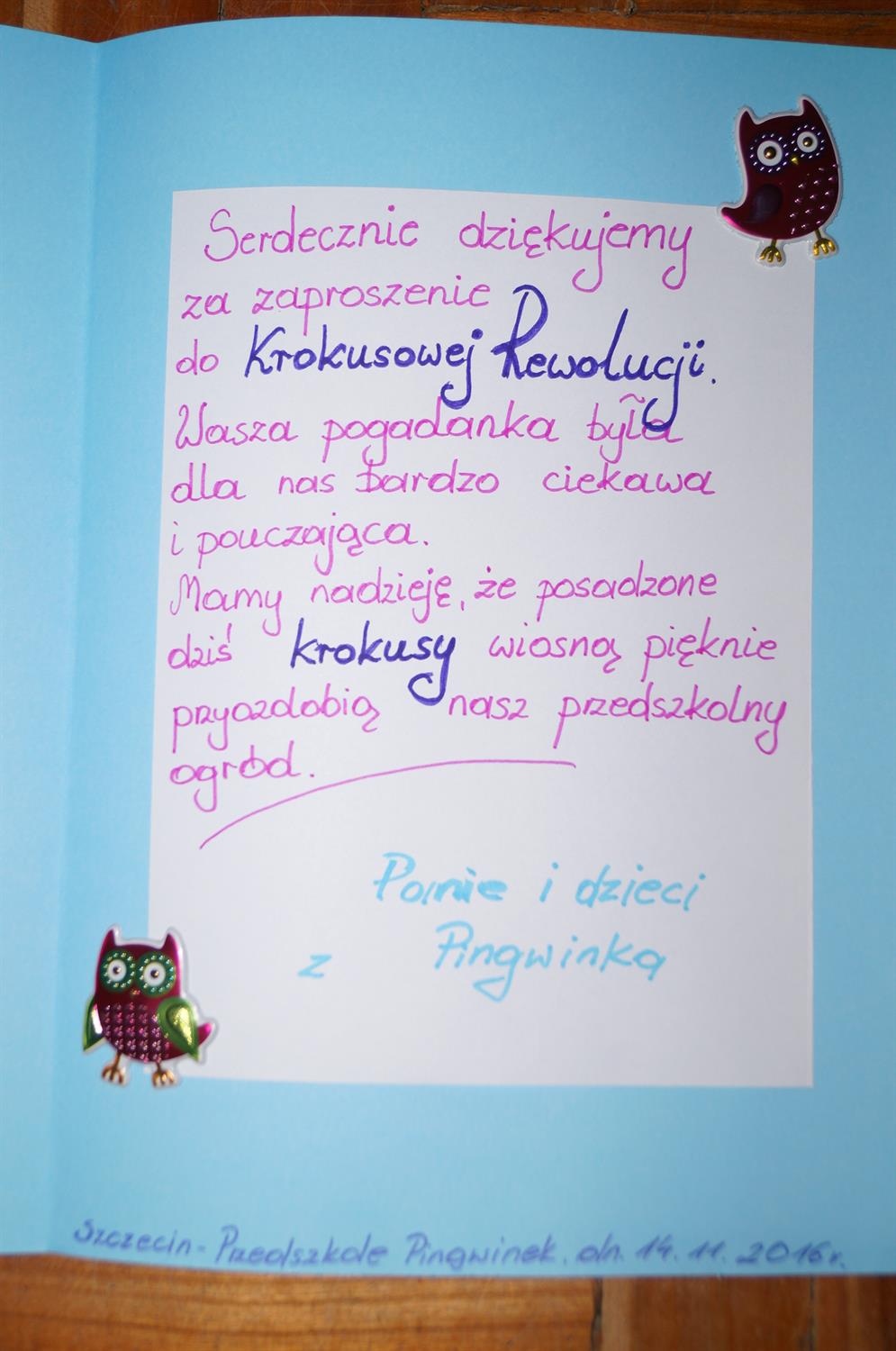Jeszcze trwał mroźny poniedziałkowy ranek a już najmłodsi rycerze Krokusowej Rewolucji szykowali się także do posadzenia kolejnych 400 cebulek na terenie Przedszkola Pingwinek przy ul. Krzywej. W akcji uczestniczyły dzieci z grup bratków i niezapominajek. Spotkanie rozpoczęło się od pogadanki z udziałem Sylwiusza Mołodeckiego o poszanowaniu przyrody. Były liczne konkursy z nagrodami, a wszyscy uczestnicy otrzymali od Marii Myśliwiec krokusowe balony i obiecali, że będą obserwować wiosną posadzone teraz przez siebie krokusy.