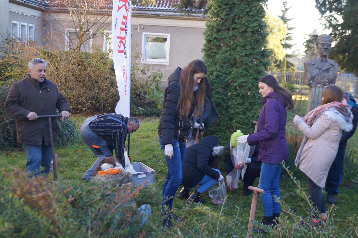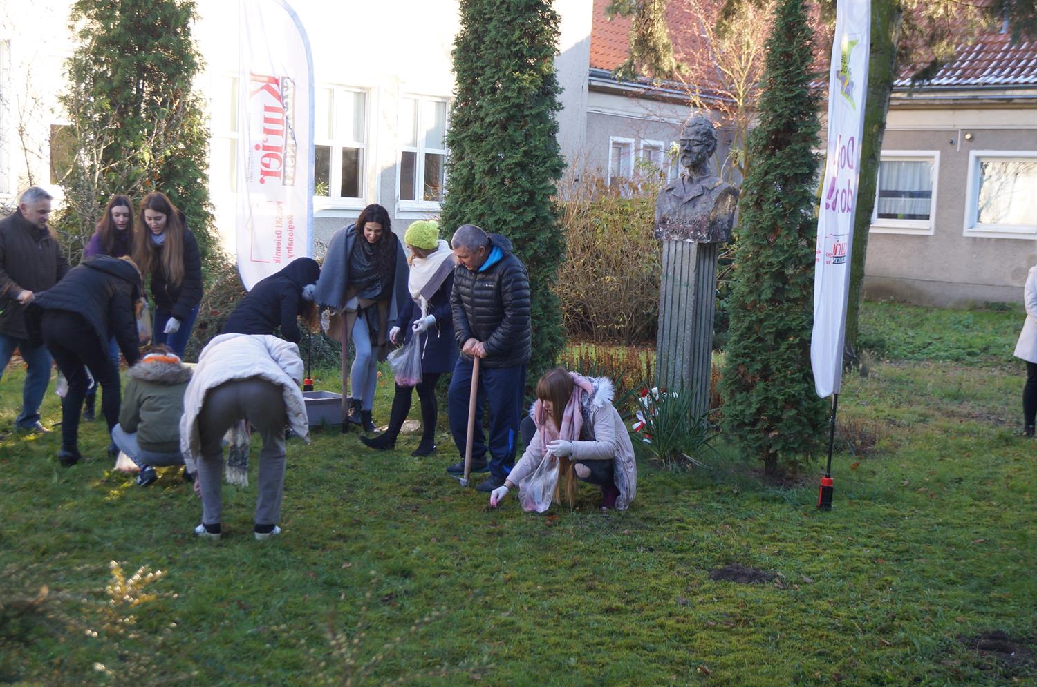 Ostatnim przystankiem w poniedziałkowym grafiku tegorocznej edycji naszej akcji było Liceum Ogólnokształcące nr 4 przy ul. św. Kingi. W sadzeniu wzięły udział dziewczęta z klasy IIIb o profilu biologiczno-medycznym. Wyzwaniem było posadzenie 1000 krokusowych cebul na zieleńcu przed popiersiem patrona szkoły Bolesława Prusa. Cel ogrodniczki osiągnięły w 18 minut, co skrupulatnie zanotowała Wiktoria, uczestniczka akcji. Jak na panujące warunki i 10-osobową ekipę sadzących należy uznać to za jeden z lepszych wyników w Szczecinie. Nic jednak w tym dziwnego zważywszy na fakt, że sadzenie przebiegało pod czujnym okiem Dariusza Frankowskiego, opiekuna grupy i nauczyciela WF.
