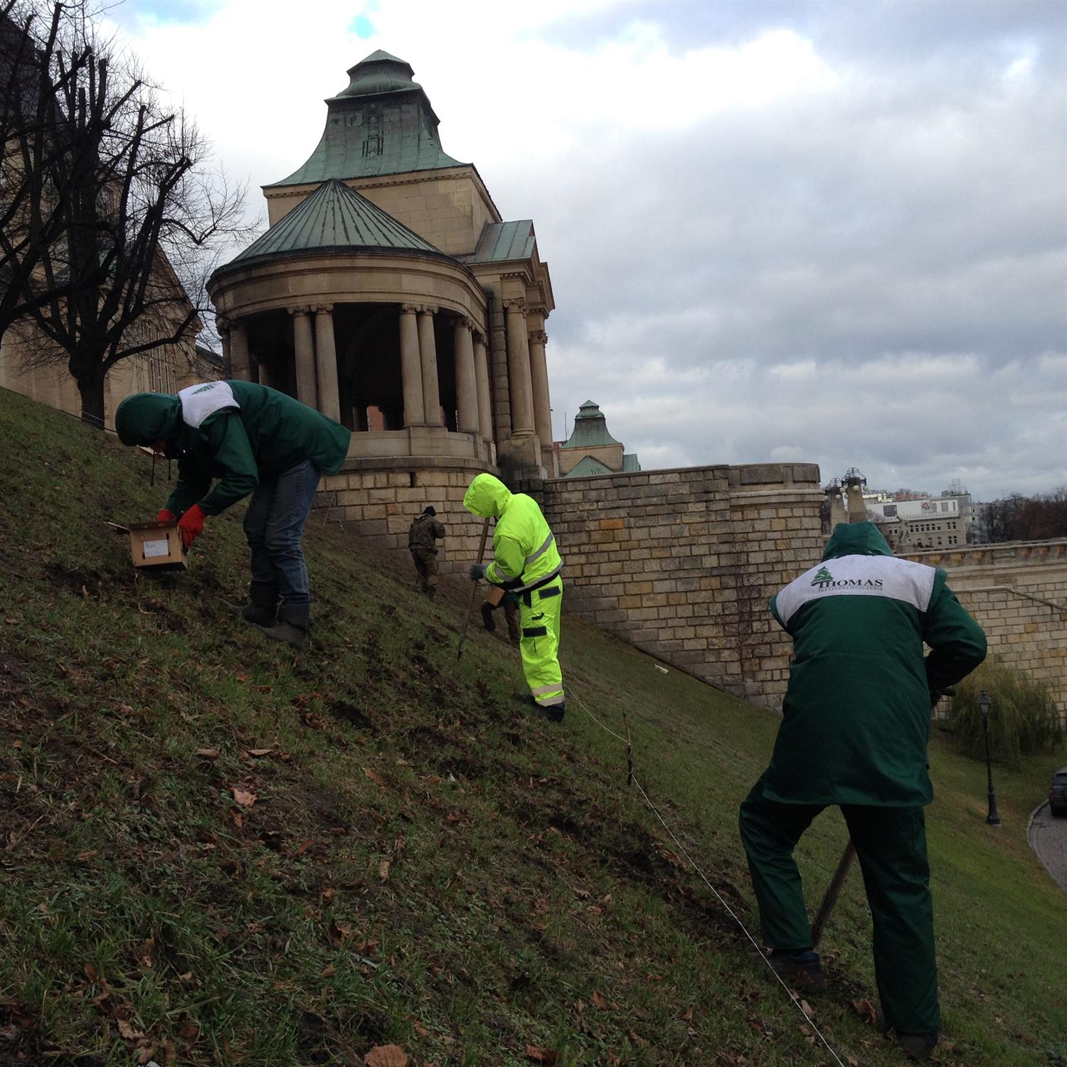 Kwiaty, czyli 150 tysięcy cebul odmiany Grand Maitre oraz 73 tysiące cebul King of Striped, sadzili pracownicy firmy Thomas. Układając z nich - wzdłuż skarp - dwa pięciometrowe pasy, które wiosną rozkwitnąć mają na ciemno- oraz jasnofioletowo (krokusy tzw. żyłkowane).