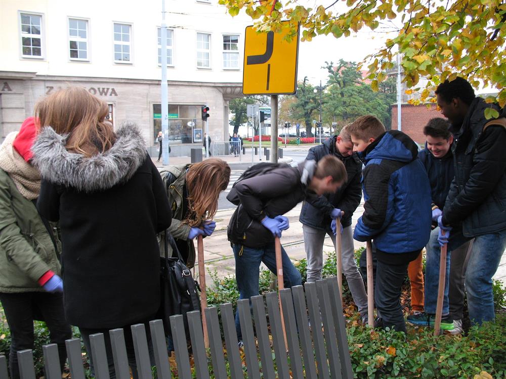 Gimnazjalistom w sadzeniu kwiatowych cebul nie przeszkadzała nawet mżawka. Za to na pewno pomógł słodki poczęstunek od Ewy Szymkowskiej, Ewy Wątroby i Renaty Traczyk (Dom-Best).