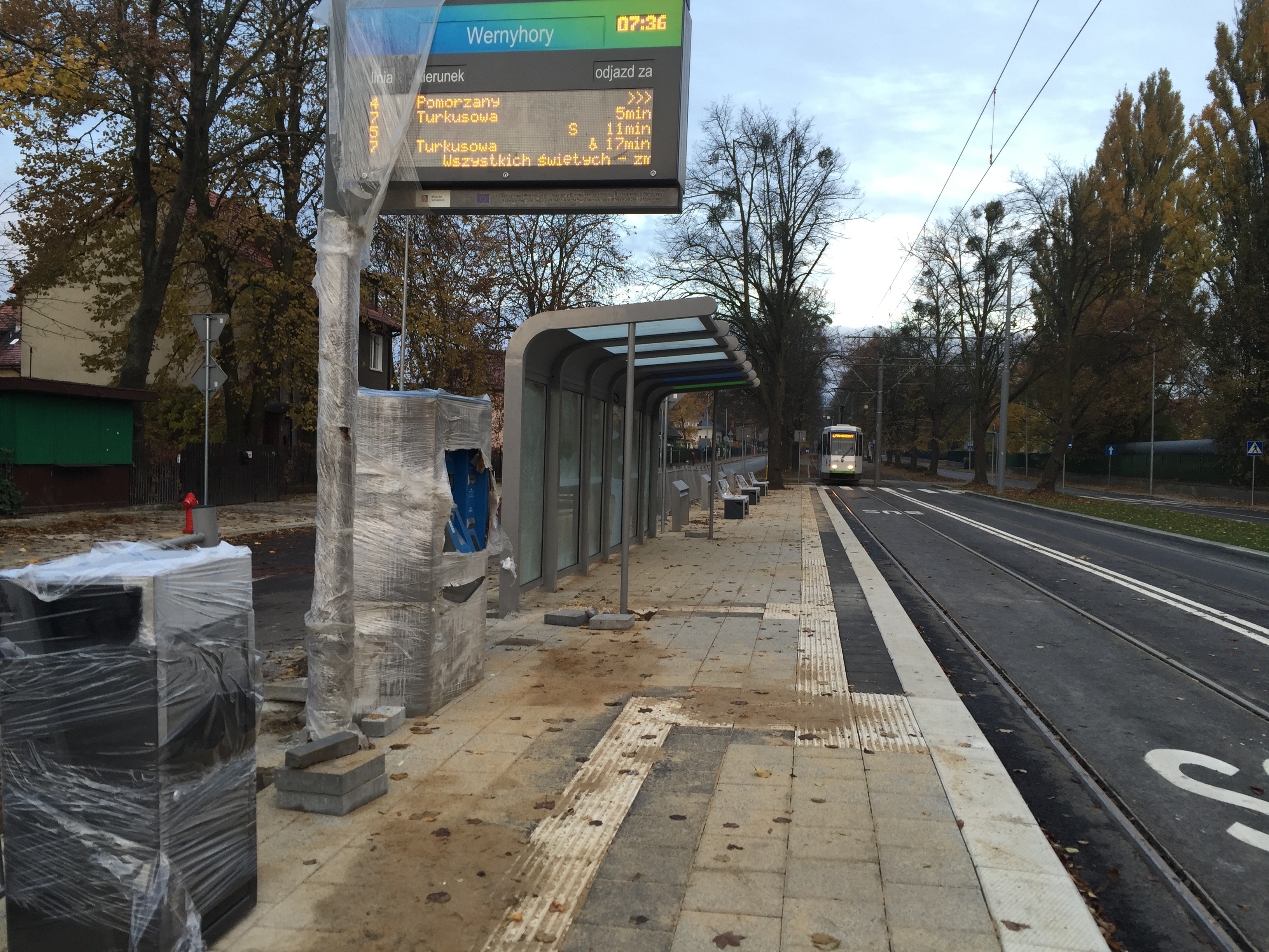 Tramwaje i autobusy wciąż zatrzymują się na tymczasowych przystankach w ul. Wernyhory w obu kierunkach oraz tych wyznaczonych dla tramwajów w ul. Żołnierskiej za skrzyżowaniem z ul. Somosierry. Bo nowe przystanki jeszcze nie są gotowe do użytku-trwa tam montaż wiat, a także przęseł barierek bezpieczeństwa.