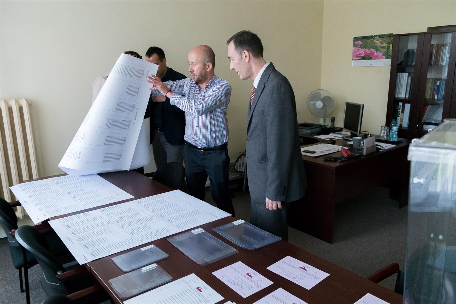 Na zdjęciu od prawej: Waldemar Gorzycki z delegatury KBW oraz radny Marek Duklanowski przyglądają się propozycji dużej karty wyborczej.