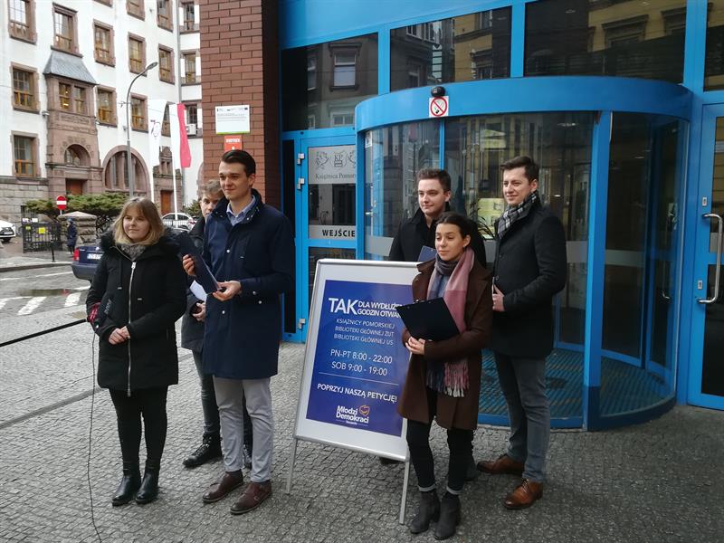 Petycję w sprawie wydłużenia godzin otwarcia Książnicy Pomorskiej przedstawili w poniedziałek szczecińscy Młodzi Demokraci. Przed głównym wejściem do największej biblioteki Pomorza Zachodniego domagali się oni również dłuższych godzin funkcjonowania bibliotek Uniwersytetu Szczecińskiego i Zachodniopomorskiego Uniwersytetu Technologicznego.
