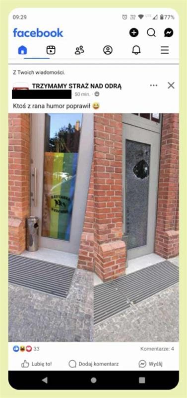 Warto dodać, że zdjęcia rozbitej szyby znalazły się na grupie obrońców granic pod nazwą "Trzymamy Straż nad Odrą". "Ktoś z rana humor poprawił" - pisze autor posta, wyrażając aprobatę dla wandalizmu. Wtórują mu inni użytkownicy, nazywając Trafostację między innymi "meliną".