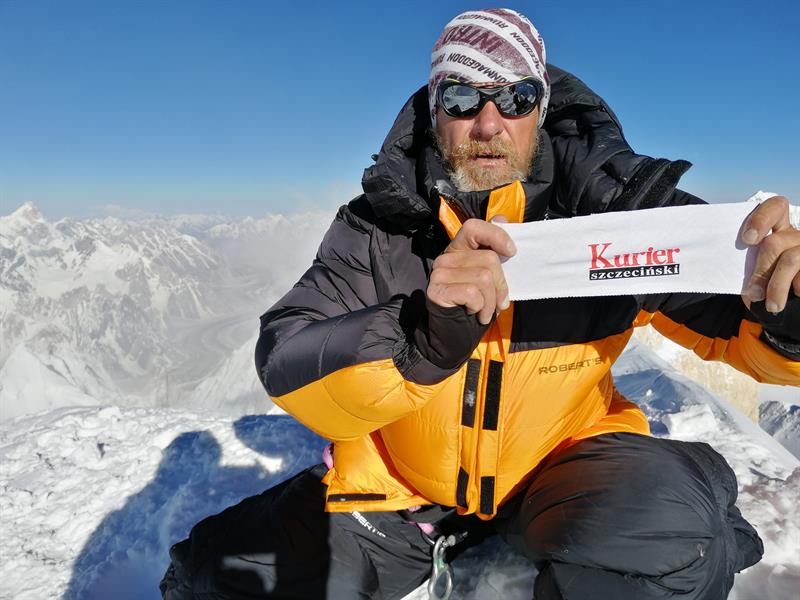 Przy okazji przypomnijmy, że patronem medialnym jego wyprawy w Karakorum był „Kurier Szczeciński”. Janusz, tak jak i podczas poprzednich wspinaczek, o naszej redakcji pamiętał, o czym świadczy to zdjęcie wykonane przez Denisa Urubko tuż po wejściu na szczyt Gaszerbrum II.