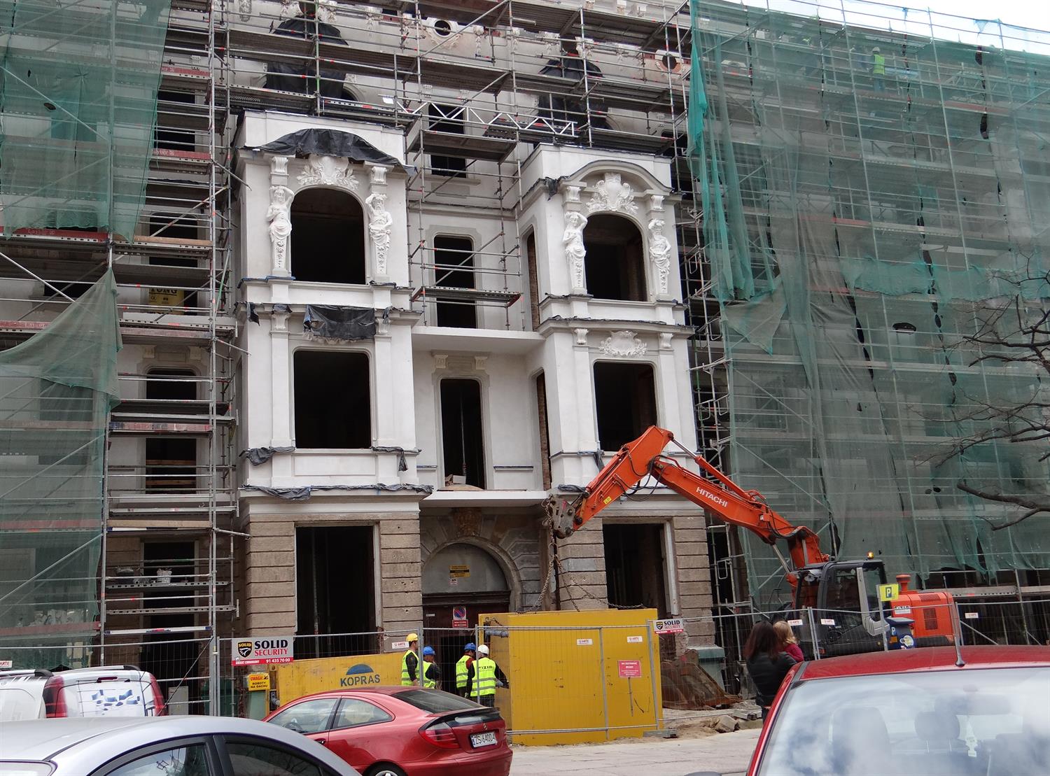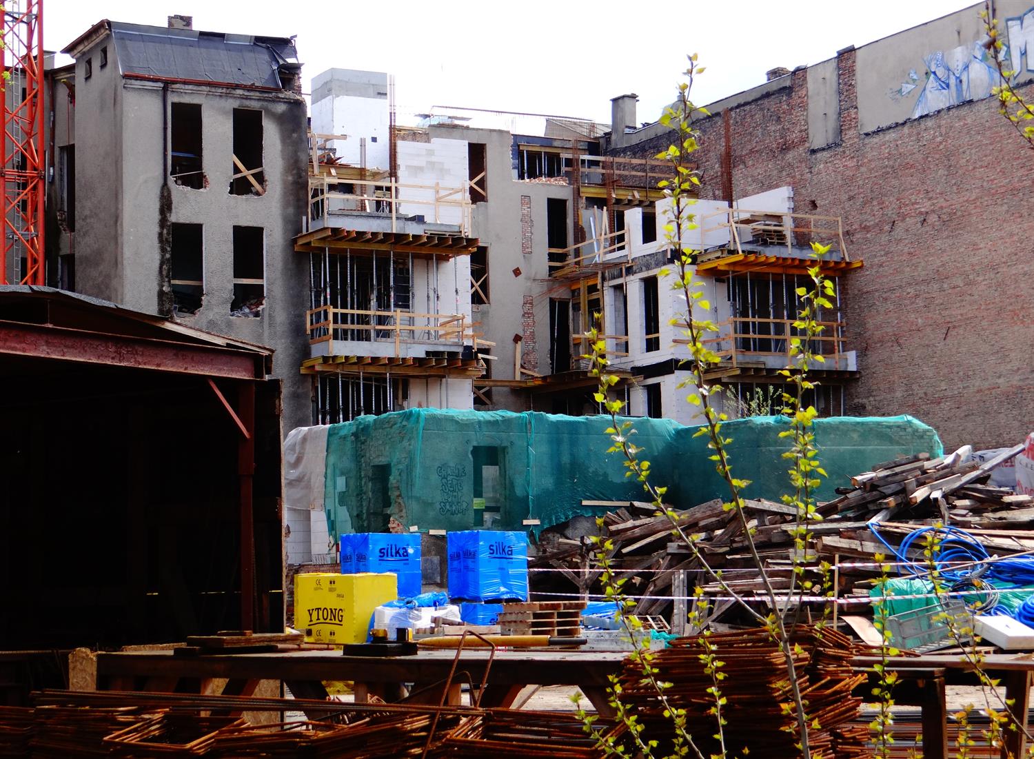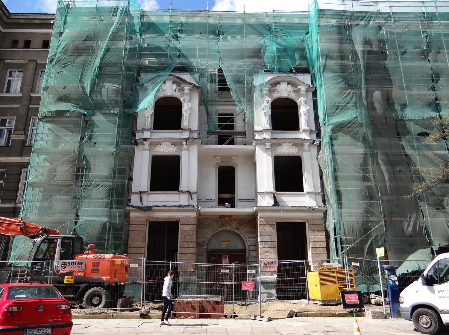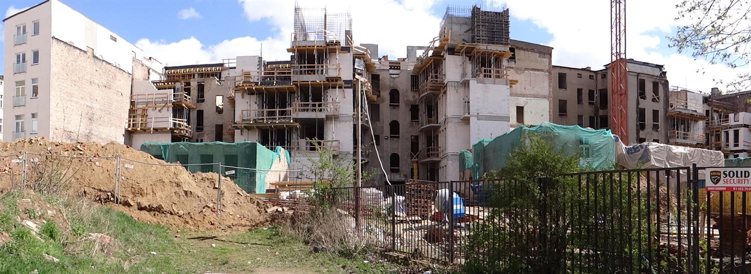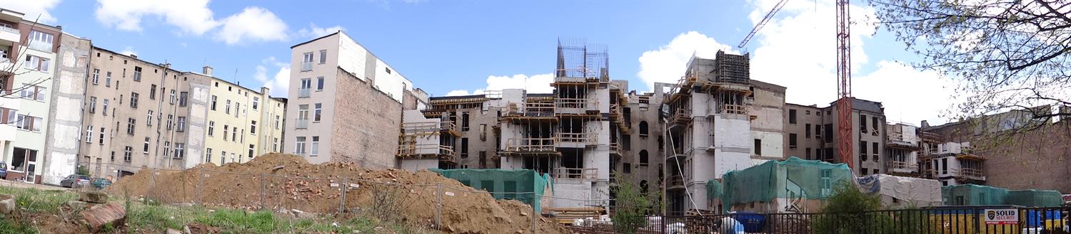Na zdjęciu:pierwszy z odsłoniętych fragmentów odnowionej elewacji frontowej jednej z kamienic przebudowywanych i odrestaurowywanych w kwartale przedwojennej zabudowy przy ul. Śląskiej w Szczecinie. I kwietniowy stan robót widziany od podwórza.