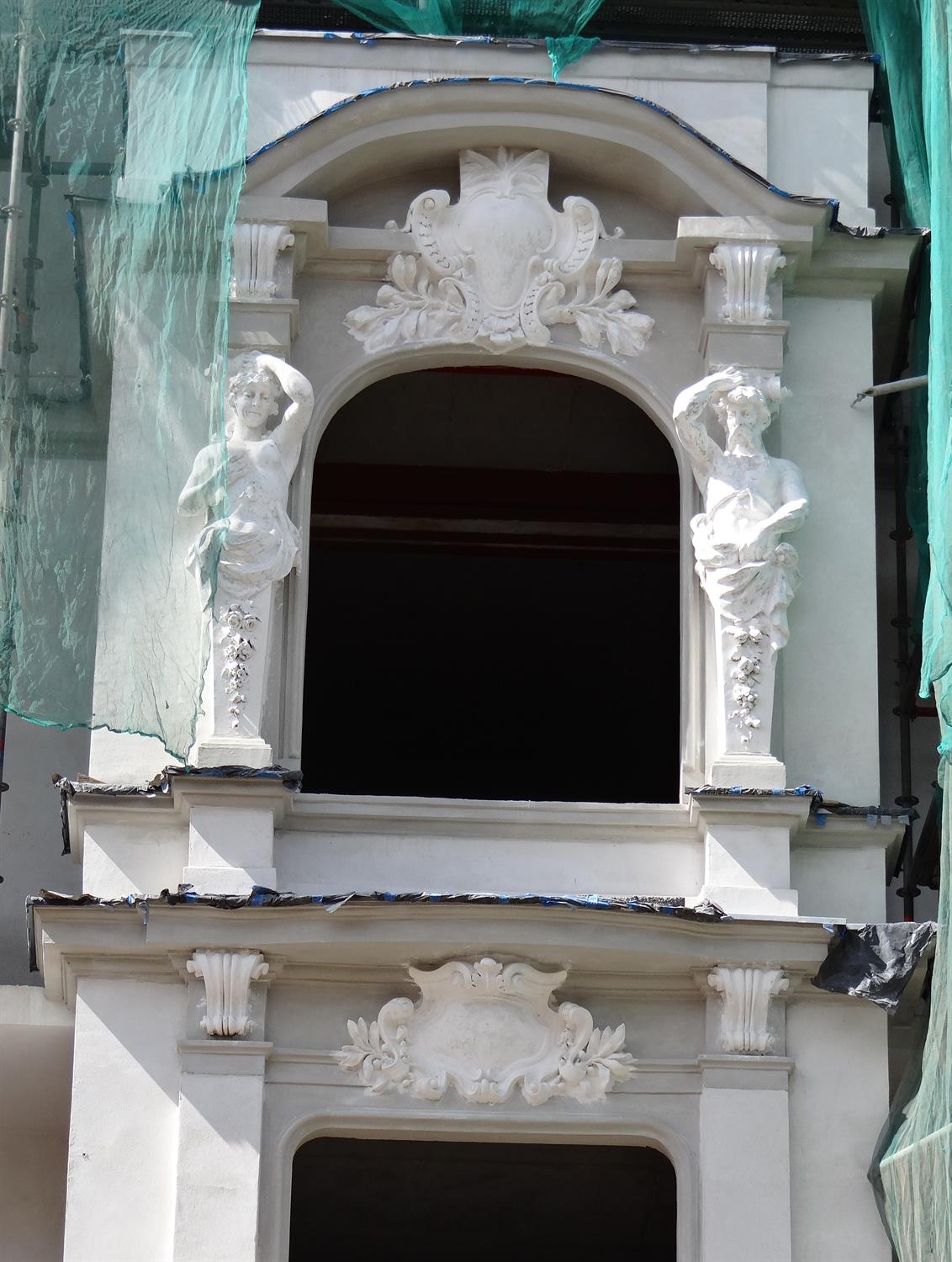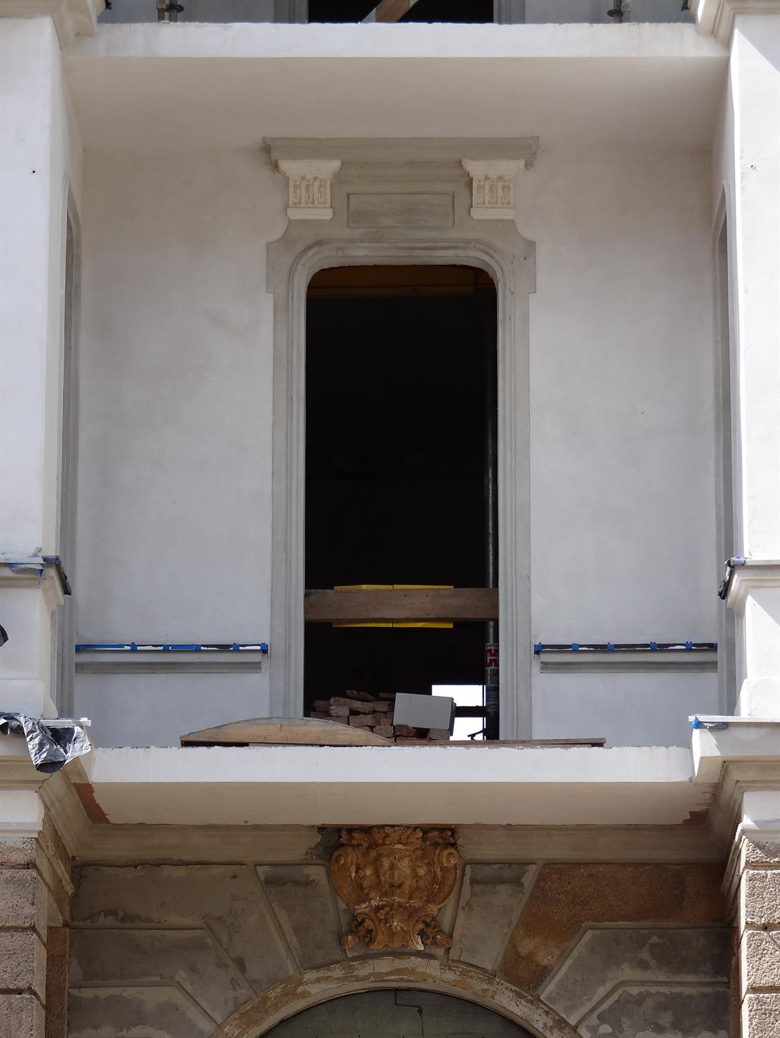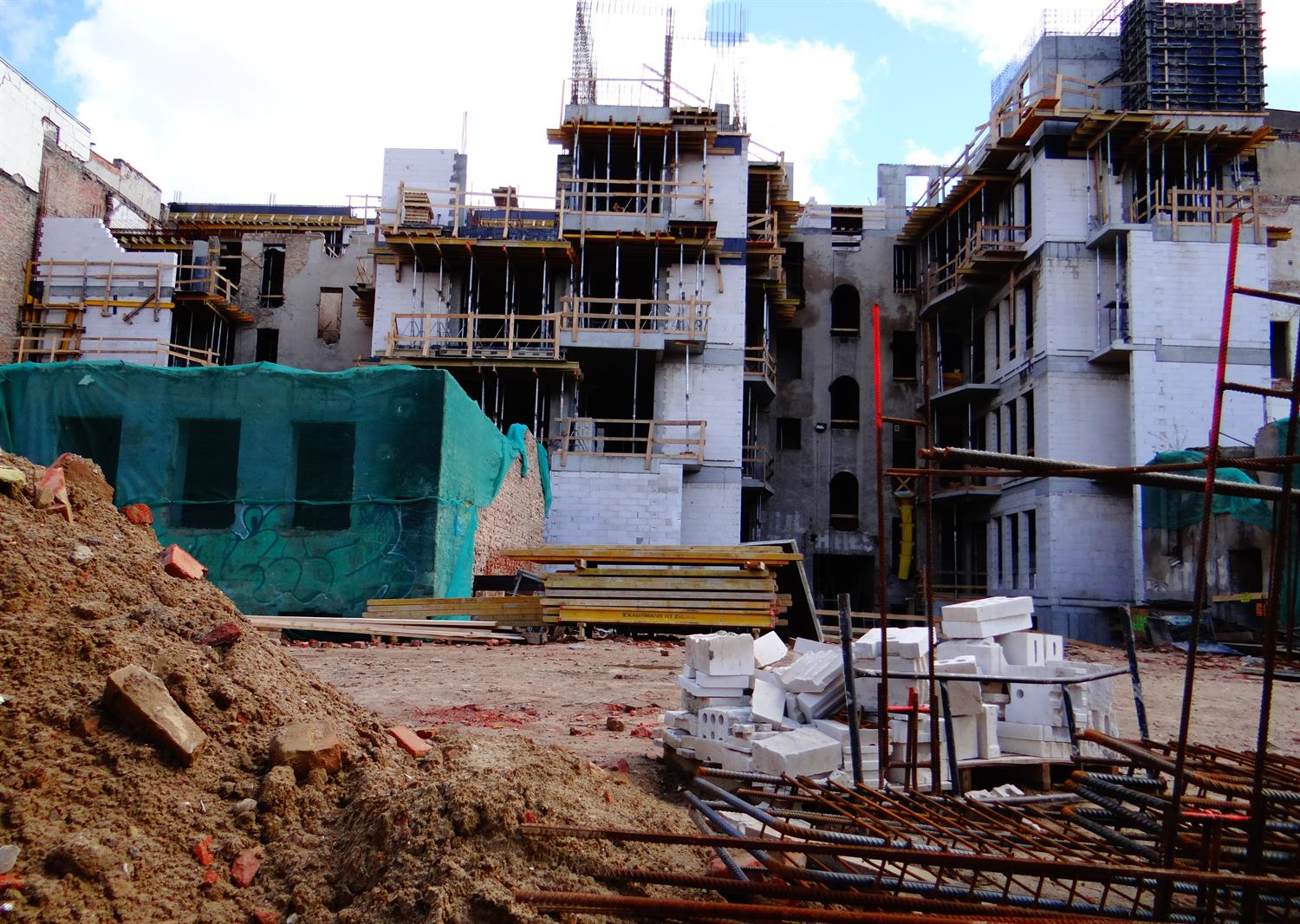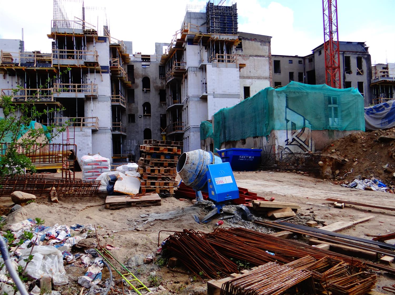 Na zdjęciu:pierwszy z odsłoniętych fragmentów odnowionej elewacji frontowej jednej z kamienic przebudowywanych i odrestaurowywanych w kwartale przedwojennej zabudowy przy ul. Śląskiej w Szczecinie. I kwietniowy stan robót widziany od podwórza.