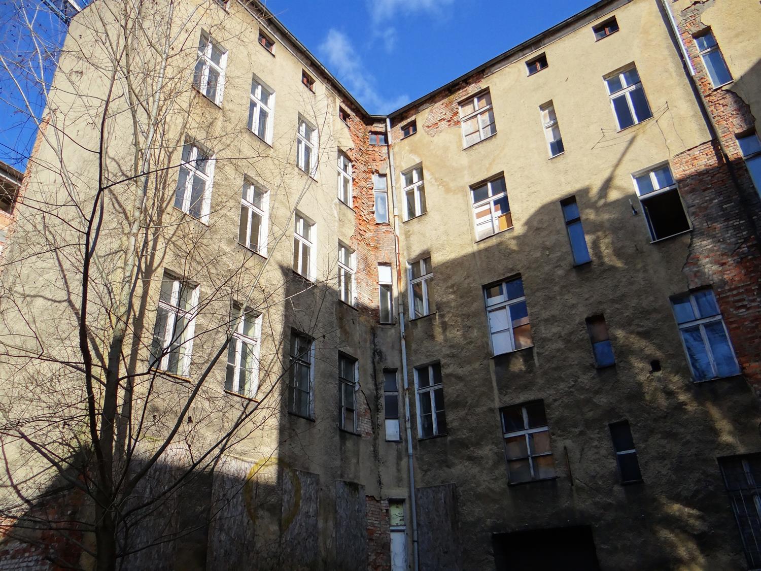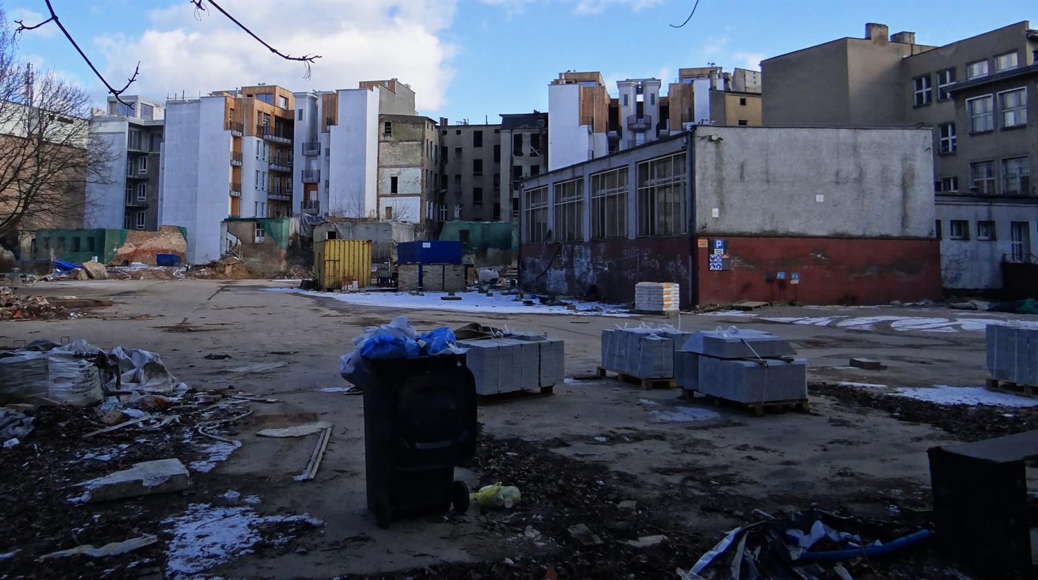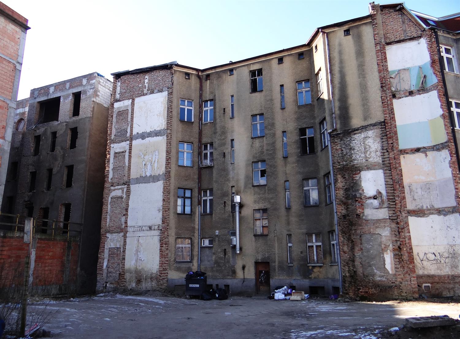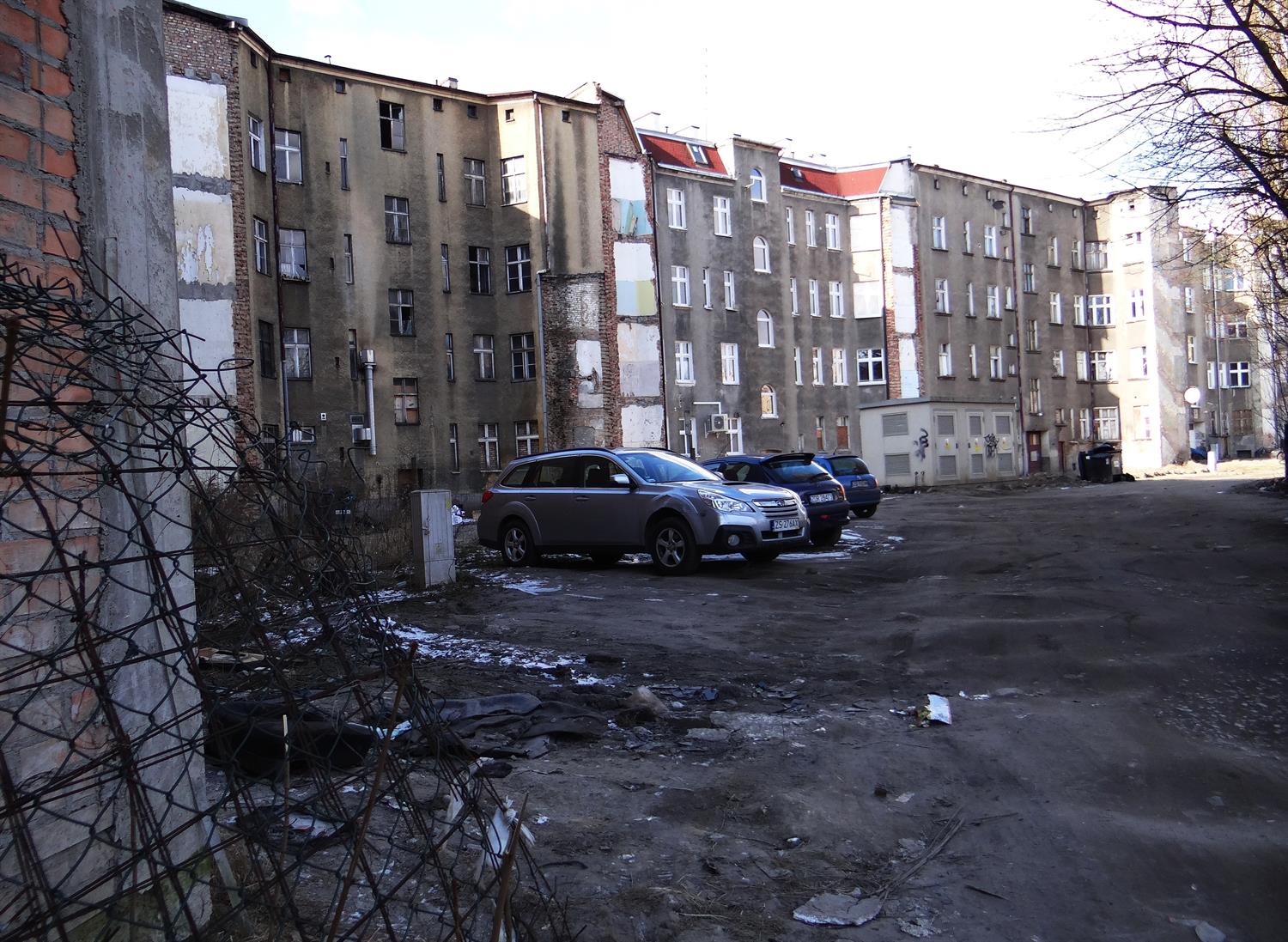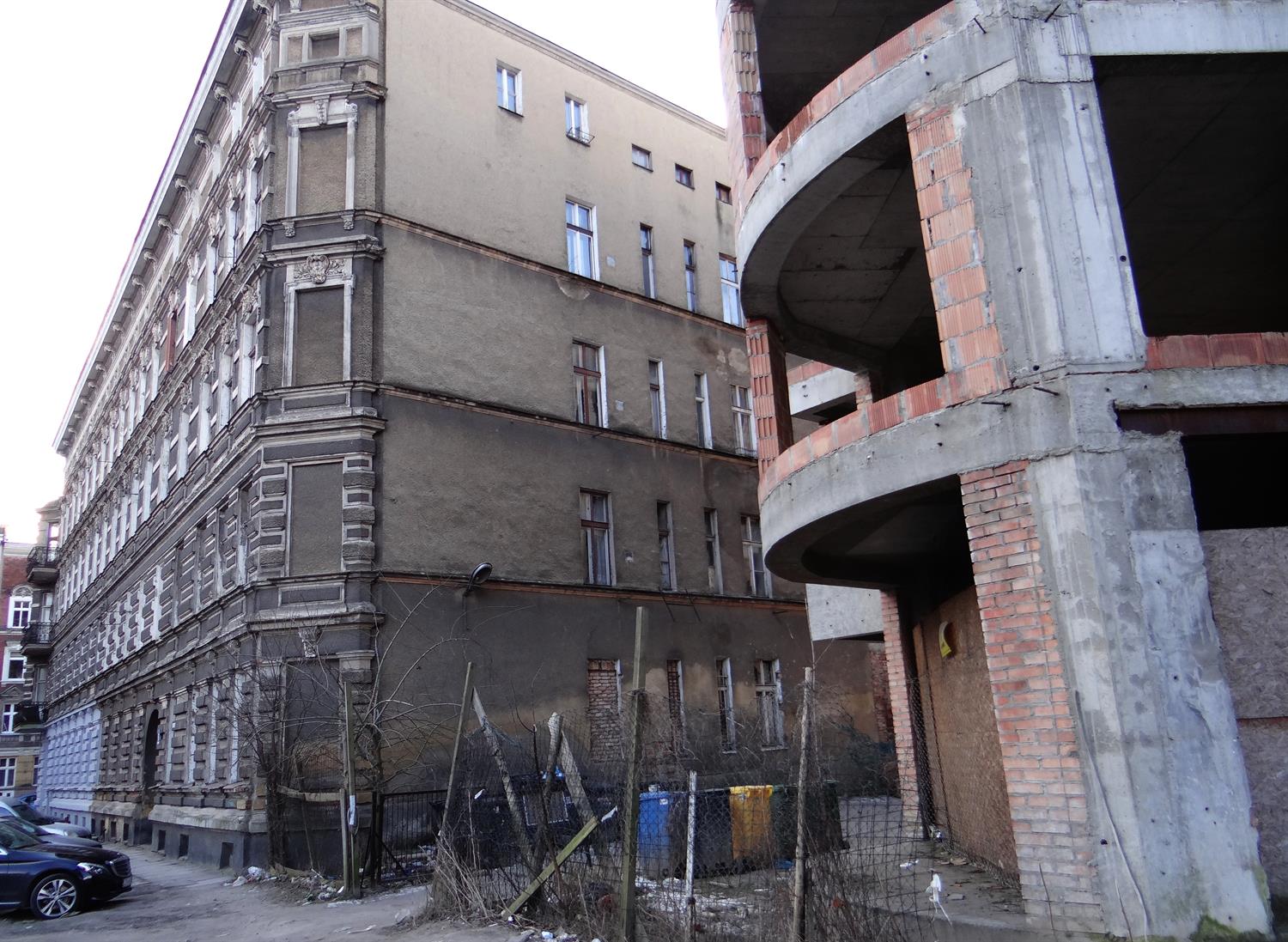 Całe wnętrze kwartału to klepisko, po deszczach zamieniające się w błotniste bajoro. Z braku miejsc postojowych, przez szczecinian zaadaptowane pod dziki parking, dla którego tłem jest ponury szkielet niedokończonego kilkupiętrowego nowego budynku. To lata temu porzucony plac budowy i kolejny symbol nieudanych szczecińskich inwestycji. Tyle że tym razem w wykonaniu spółki CONCAT Polska o hiszpańskim rodowodzie.
