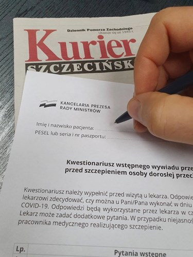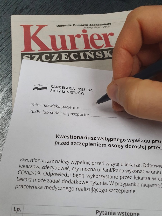 Każdy, kto zamierza się zaszczepić przeciwko COVID-19, musi wcześniej wypełnić kwestionariusz. Może to zrobić w punkcie szczepień albo w domu. Skąd go wziąć? Dostarczymy go Państwu w poniedziałkowym wydaniu „Kuriera”.