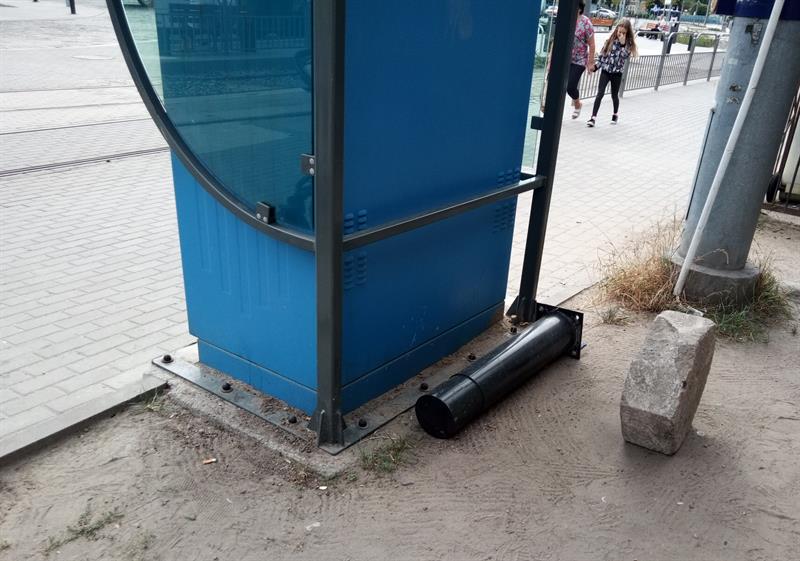 ustawienie wielu słupków na tej ulicy to hit, nigdy czegoś takiego nie widziałem, są cztery takie miejsca gdzie postawione są słupki nie wiadomo w jakim celu i czemu mają służyć, jednym z tych był ten co teraz leży za biletomatem, pojedynczy słupek na środku szerokiego chodnika - główna trasa z przystanku autobusowego na tramwaj. Kto to robił? idiota?