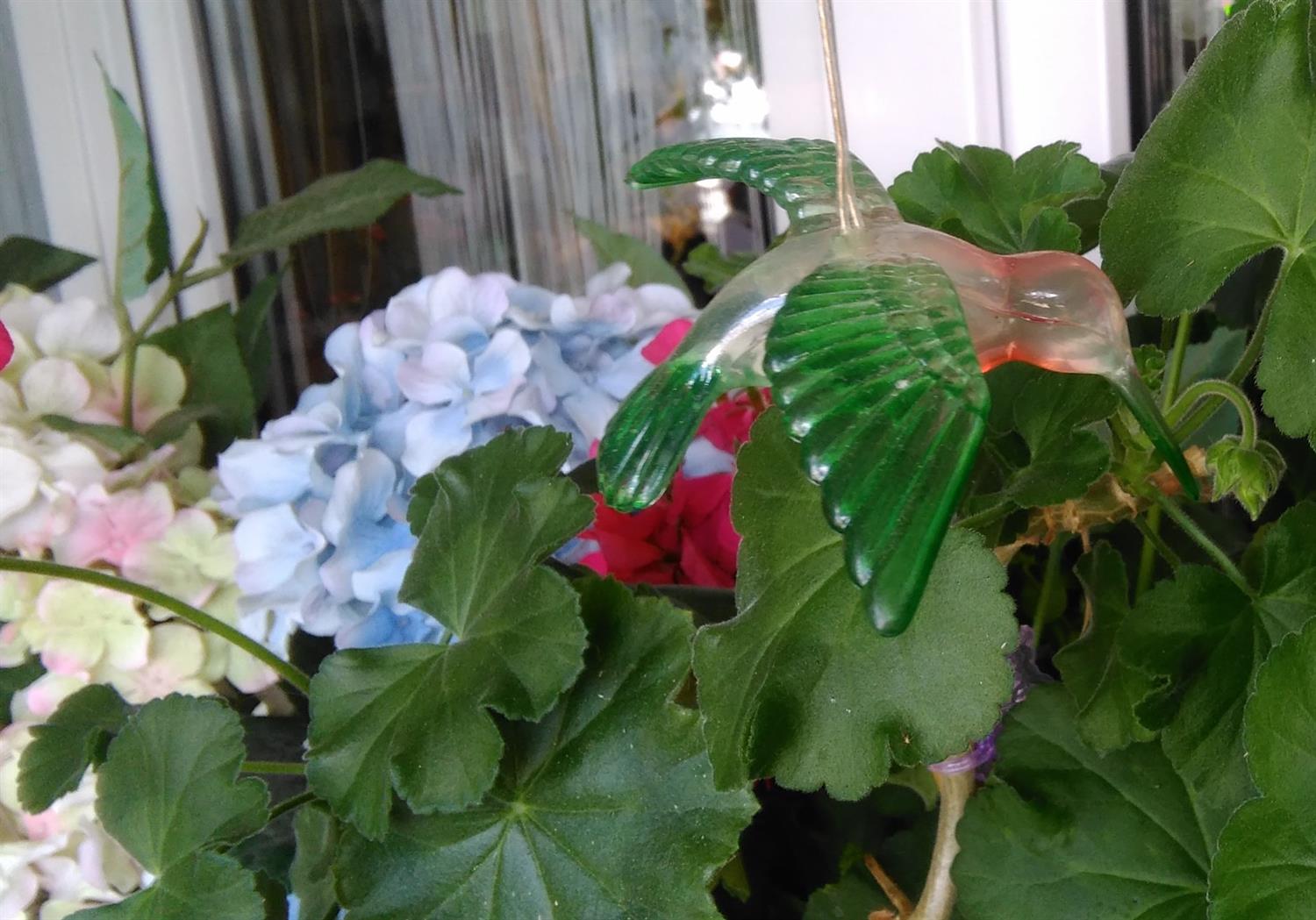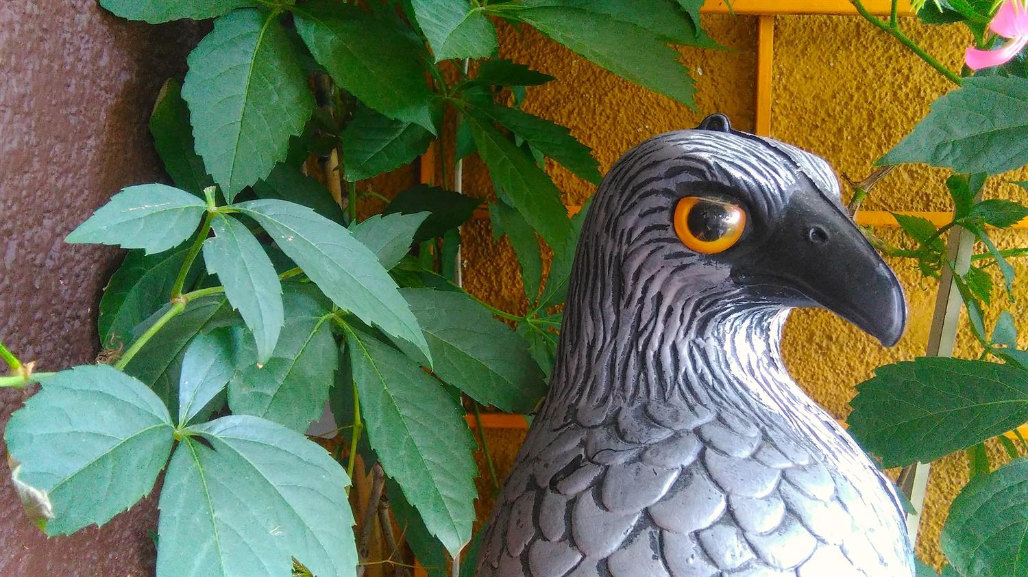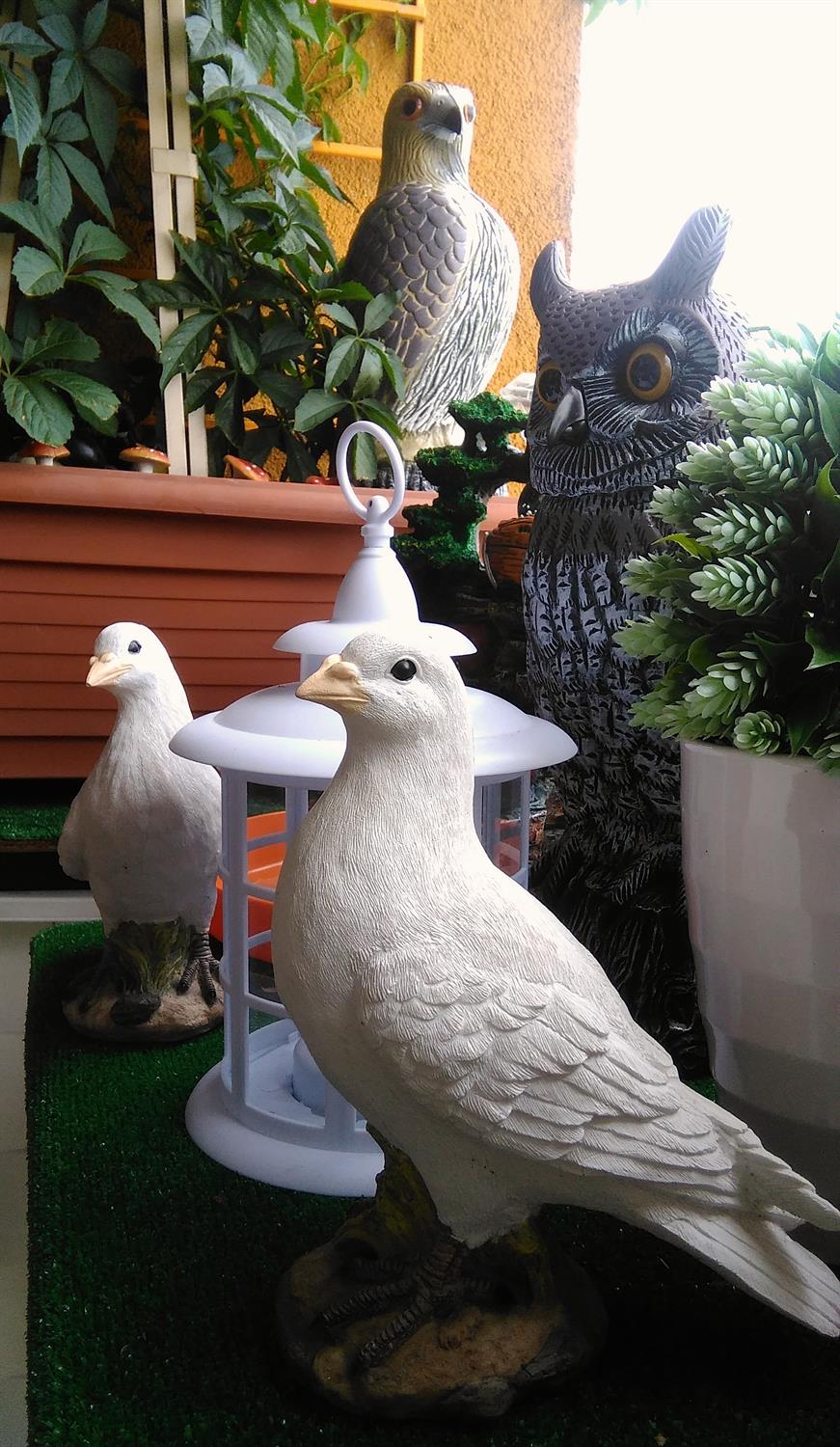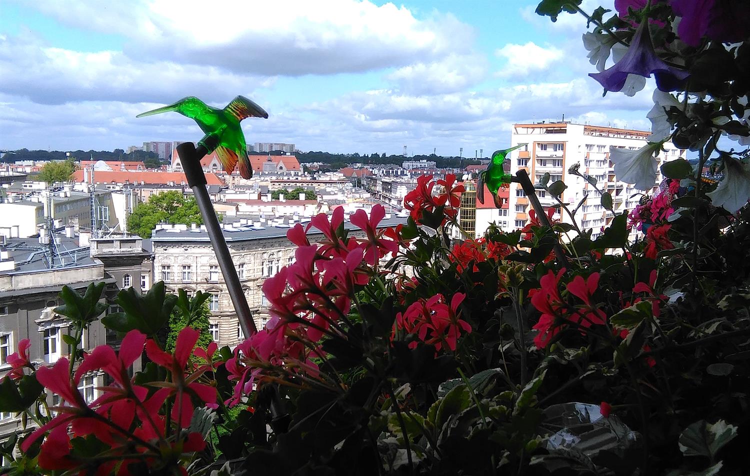W fontannie wiruje szklana kula. Barwne kolibry odbijają się w wirujących na wietrze lustrzanych soplach. Na straży winorośli siedzą sokoły, a u pędów rdestówki przycupnęła czapla, w towarzystwie pelikana i pary kogutów. Kolorowa menażeria pośród pelargonii, begonii i surfinii - zaskakująca przestrzeń balkonowa w al. Wojska Polskiego.