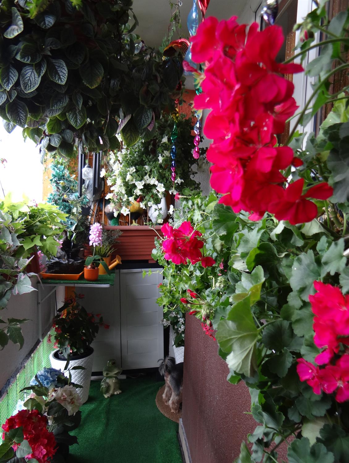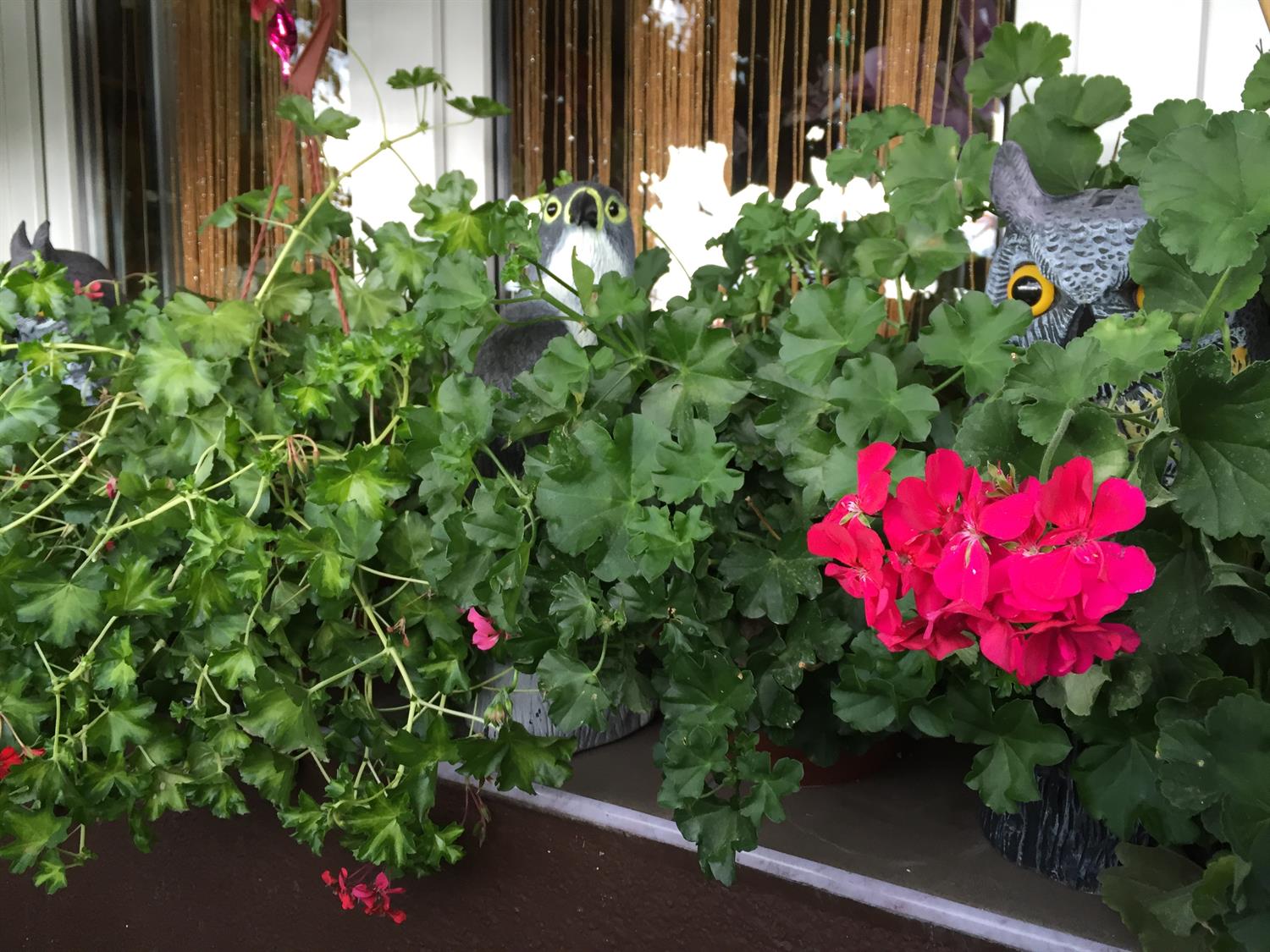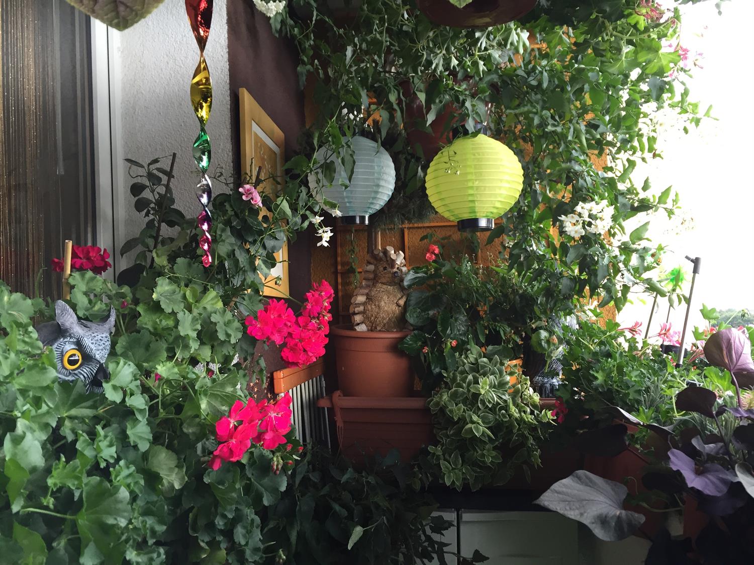Pośród pelargonii ma parapecie przysiadły malowane ptaki, wśród nich sokół i sowy. Jest czapla, są wróbelki. Jest i kura.. Teraz są elementem dekoracji, choć kupowane były w konkretnym celu: by odstraszać gołębie, próbujące na balkonie się zadomowić. Lepszym rozwiązaniem są zwykła folia na patyku, robiąca hałas, czy różnego rodzaju wiatraczki. W jednej z donic pod krzewem „przysiadł” dla odmiany jeż.