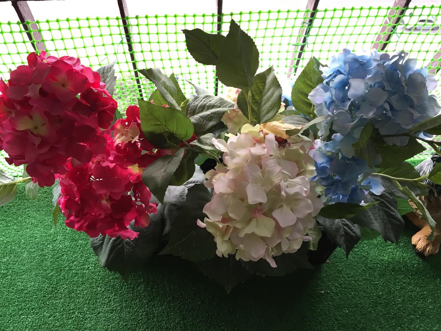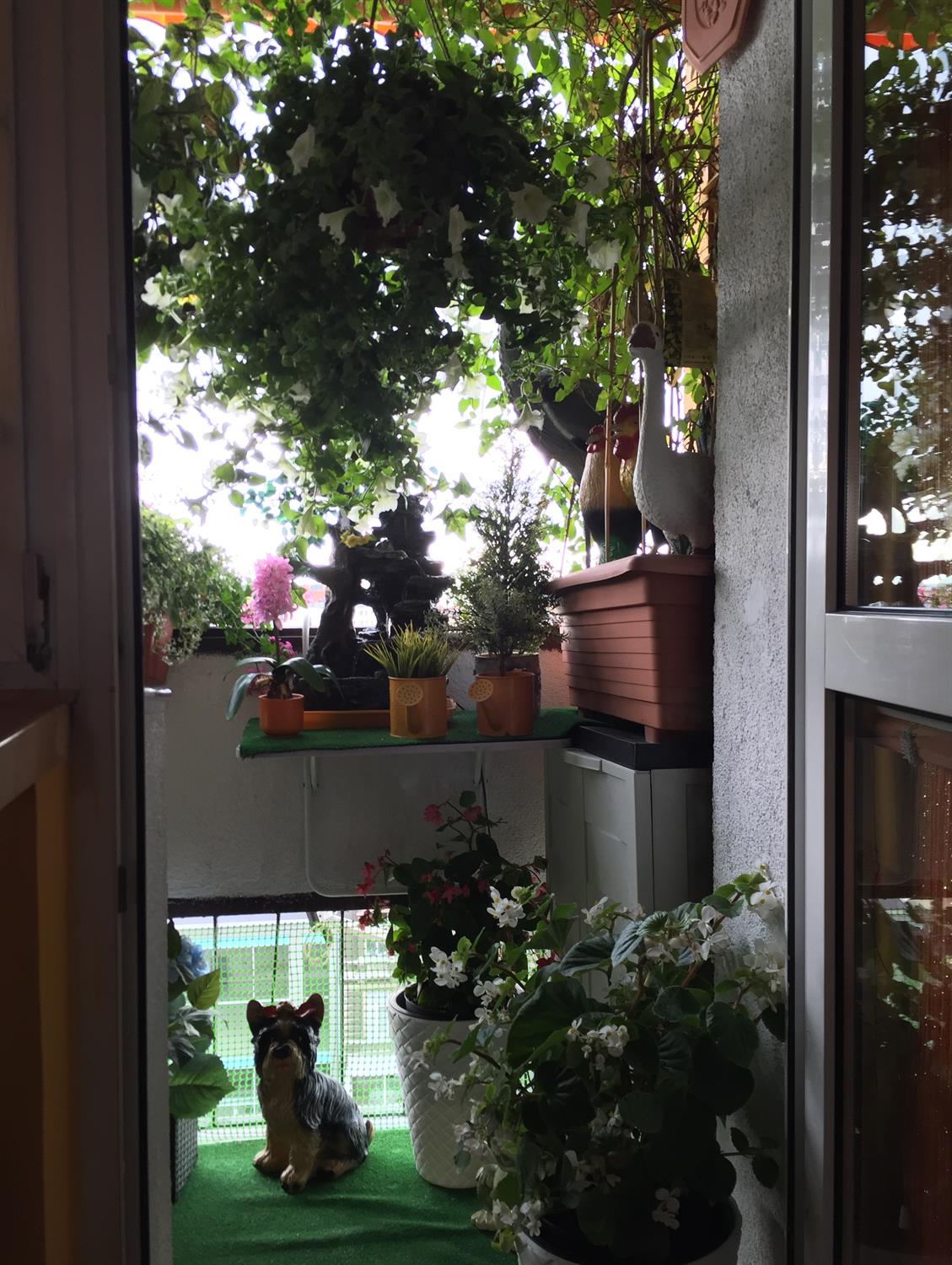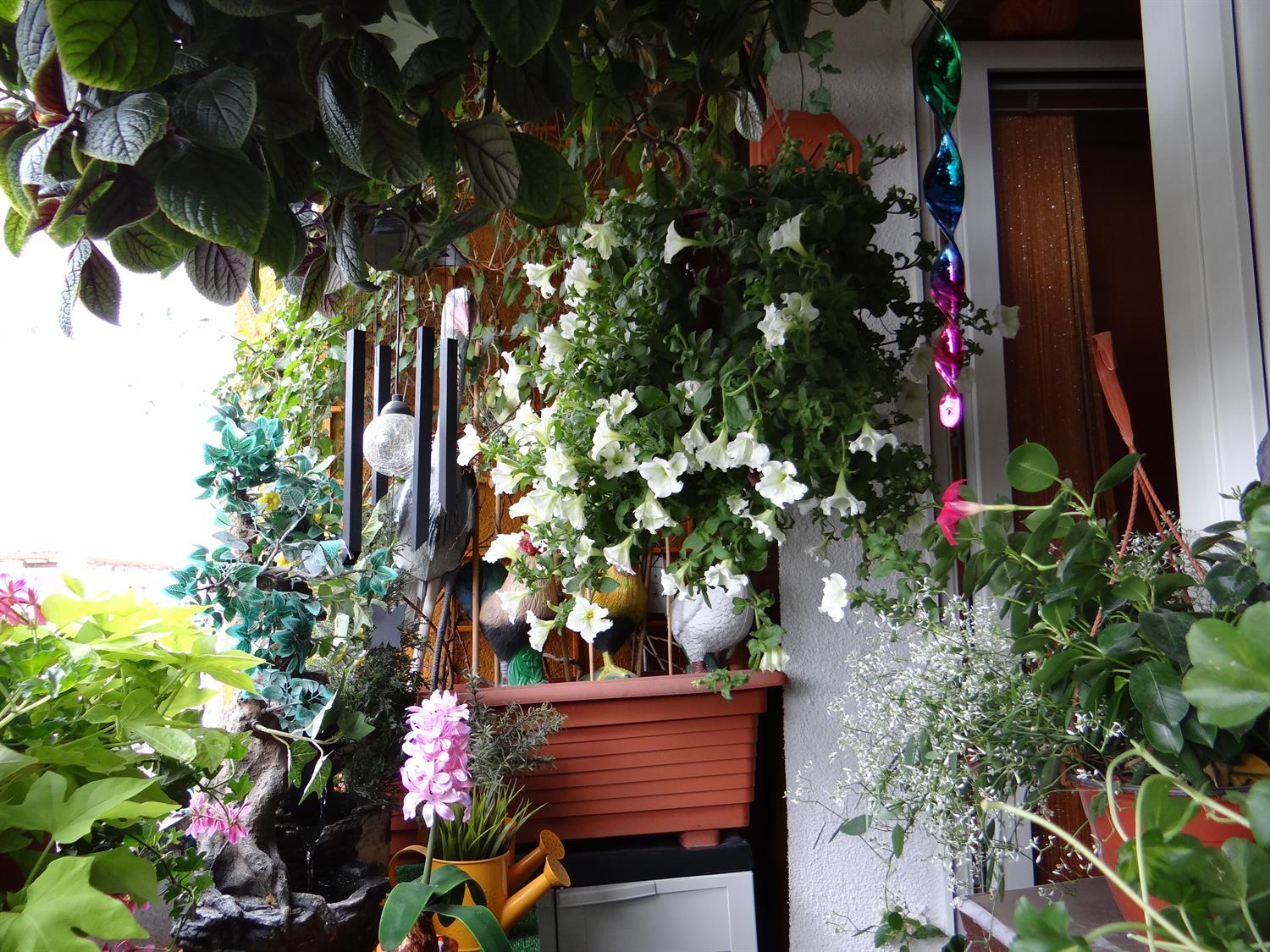 Pośród pelargonii ma parapecie przysiadły malowane ptaki, wśród nich sokół i sowy. Jest czapla, są wróbelki. Jest i kura.. Teraz są elementem dekoracji, choć kupowane były w konkretnym celu: by odstraszać gołębie, próbujące na balkonie się zadomowić. Lepszym rozwiązaniem są zwykła folia na patyku, robiąca hałas, czy różnego rodzaju wiatraczki. W jednej z donic pod krzewem „przysiadł” dla odmiany jeż.