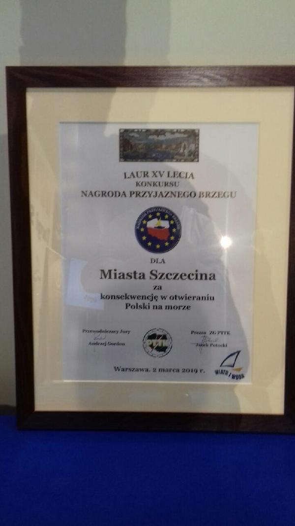Nagrody zostały wręczone podczas tegorocznej 31. edycji Targów Wiatr i Woda w Warszawie. Wśród klasycznych nagród znalazły się specjalne trzy "Laury XV-lecia Konkursu Nagrody Przyjaznego Brzegu". Są one dowodem uznania za wieloletnie konsekwentne działania na rzecz promocji krajowej turystyki wodnej. Właśnie jednym z tych „Laurów” uhonorowano Szczecin za "konsekwencję w otwieraniu Polski na morze". Nagrodę dla stolicy regionu odebrał Jerzy Raducha, wicedyrektor ds. organizacji imprez i współpracy międzynarodowej z Centrum Żeglarskiego.
