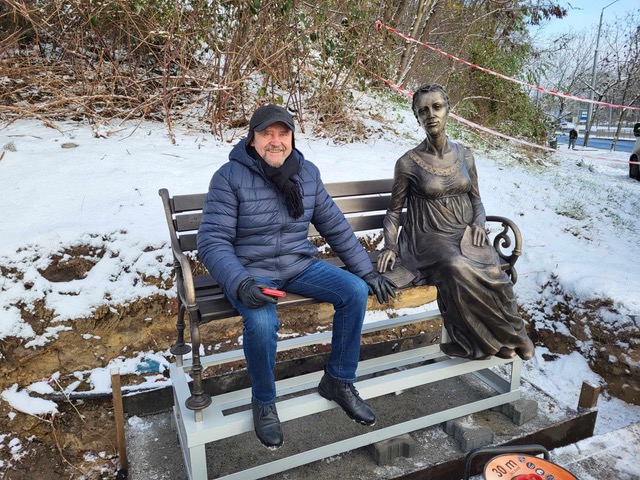 Autor rzeźby, prof. dr hab. Marian Molenda, przysiadł na ławeczce obok Sophie Tilebein. Fot. UM Szczecin