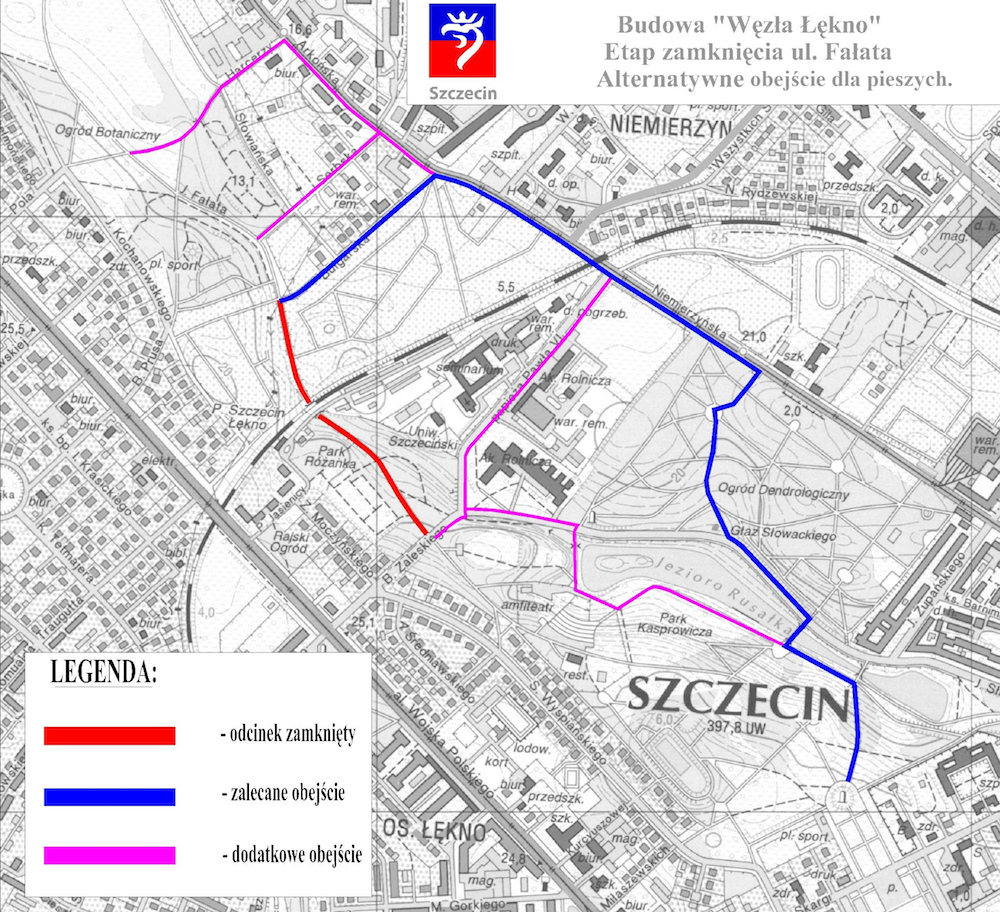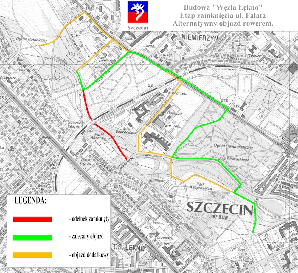 W związku z przygotowaniami do budowy kolejnego odcinka tzw. trasy średnicowej z nowym węzłem komunikacyjnym Łękno, od środy (5 grudnia) zaczną obowiązywać pierwsze zmiany w organizacji ruchu w rejonie rozpoczynanej właśnie inwestycji. Najpierw zablokowany zostanie ciąg pieszo-rowerowy biegnący parkową aleją Fałata na wysokości Różanki od ul. Bohdana Zaleskiego do okolic przejścia przez park im. Jana Kasprowicza w stronę ul. Bułgarskiej. Inaczej niż dotąd działać ma też - po przeprogramowaniu - sygnalizacja świetlna przy skrzyżowaniu al. Wojska Polskiego z ul. Piotra Skargi.