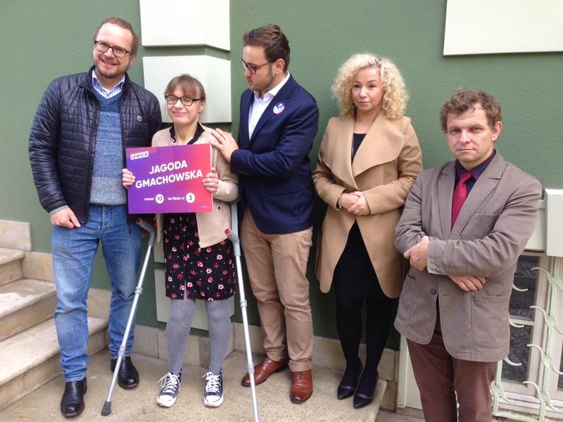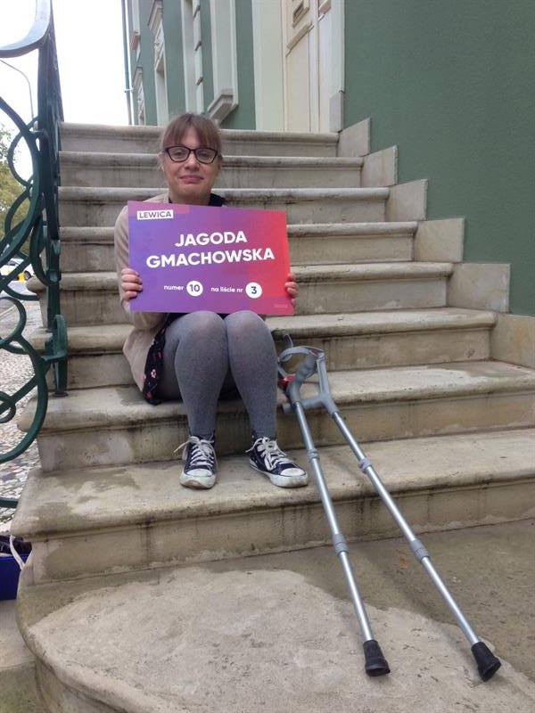 Jagoda Gmachowska startuje z listy nr 3 (z numeru dziesiątego). Jest niepełnosprawna ruchowo. Porusza się o kulach. Jak twierdzi, z tego powodu była dyskryminowana całe życie.