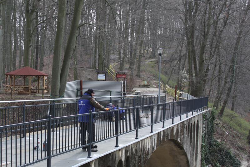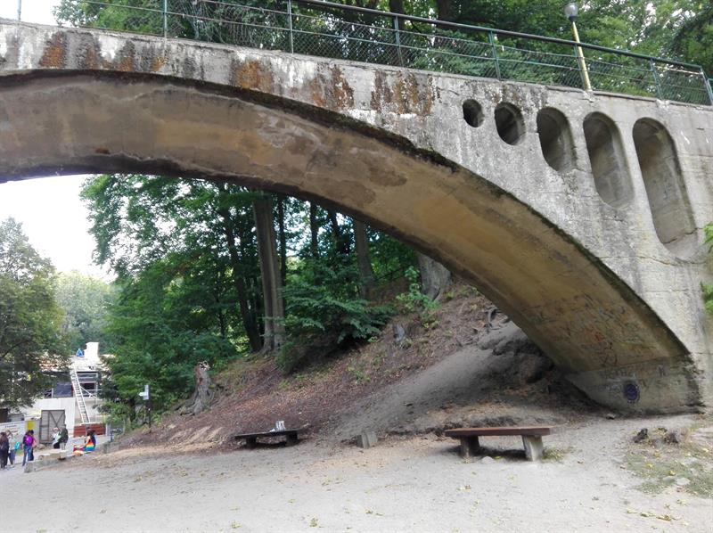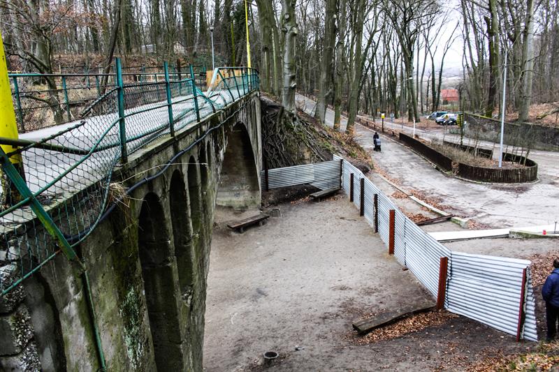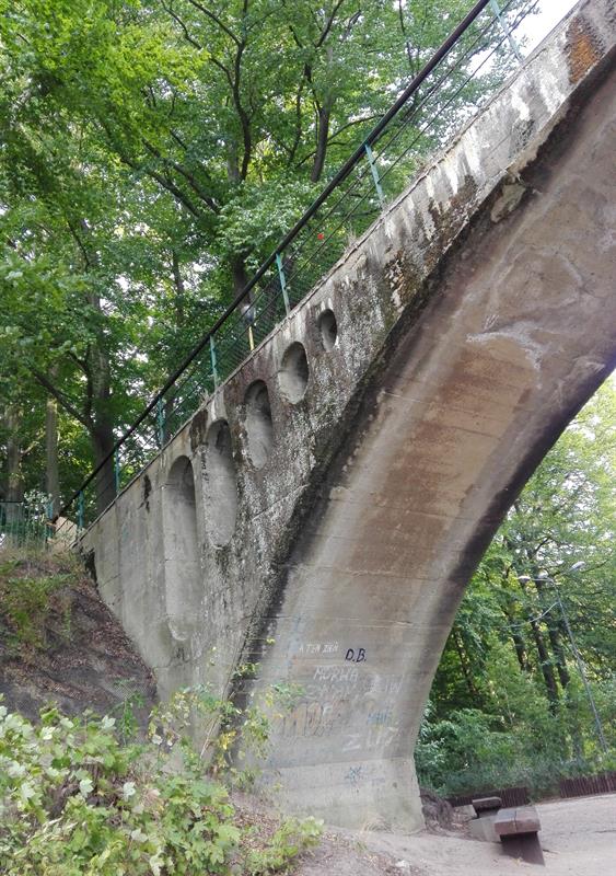 Na konstrukcji widać spękania, nacieki, ubytki w nawierzchni i korozję betonu, czyli obraz lat zaniedbań i braku właściwej konserwacji. W takim stanie jest wiekowy mostek łukowy nad Jeziorem Szmaragdowym. Jednak tylko jego nakładka i barierki są remontowane.