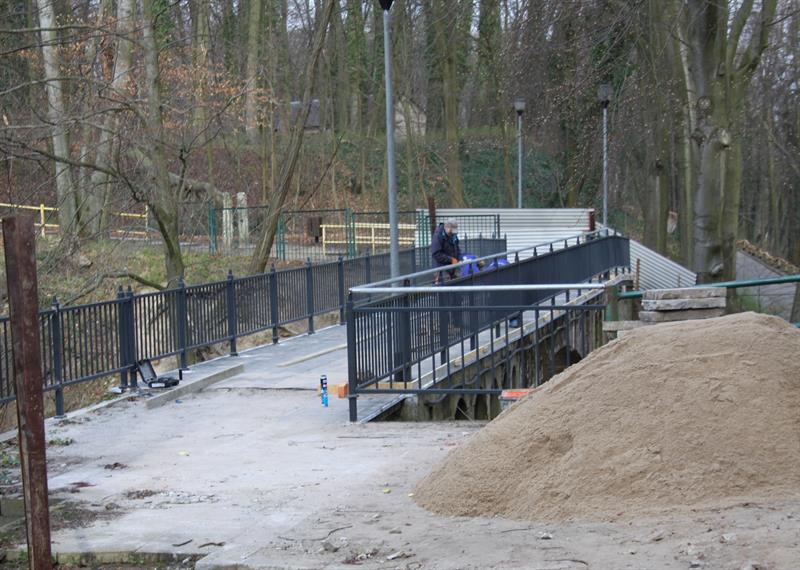 Remont mostku rozpoczął się z opóźnieniem i wciąż trwa. Jednak jego zakres jest bardziej ograniczony, niż można się było spodziewać. Nie dotyczy całej konstrukcji nośnej tego betonowego wiaduktu niegdysiejszej kolejki kopalnianej. Którą - przypomnijmy - wywożono urobek kredy do cementowni „Stern" działającej w tym rejonie w latach 1880-1925. Na wiekowym mostku jest tylko wylewana posadzka i montowane nowe balustrady.