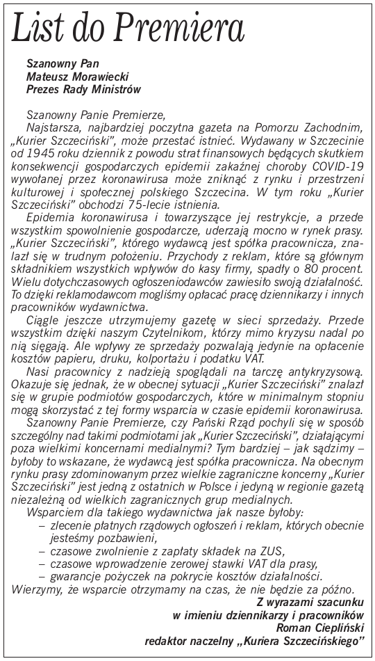 Szanowny Panie Premierze, czy Pański Rząd pochyli się w sposób szczególny nad takimi podmiotami jak „Kurier Szczeciński”, działającymi poza wielkimi koncernami medialnymi? Tym bardziej – jak sądzimy – byłoby to wskazane, że wydawcą jest spółka pracownicza. Na obecnym rynku prasy zdominowanym przez wielkie zagraniczne koncerny „Kurier Szczeciński” jest jedną z ostatnich w Polsce i jedyną w regionie gazetą niezależną od wielkich zagranicznych grup medialnych.