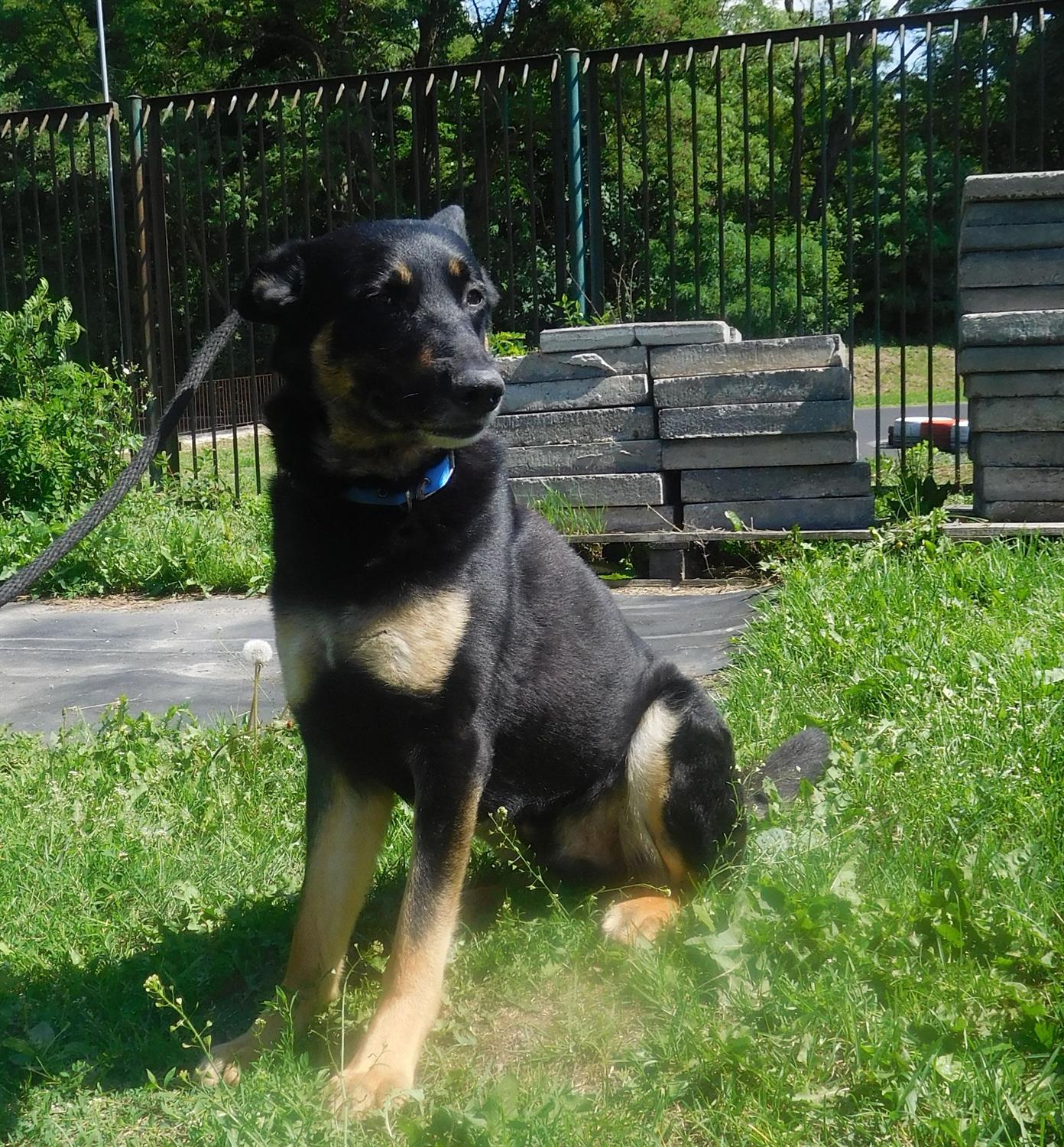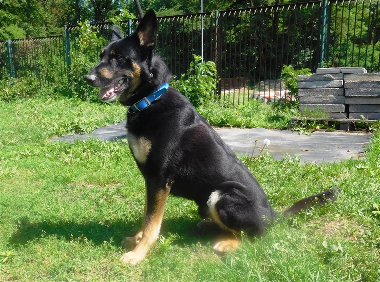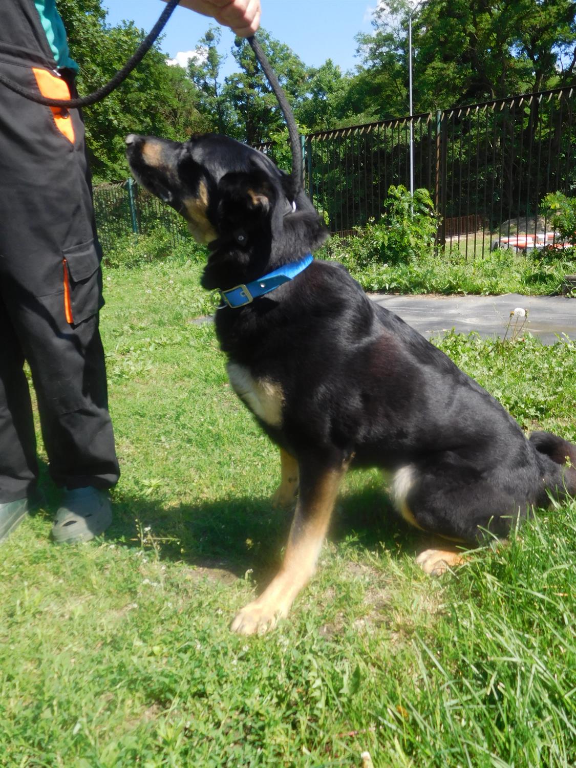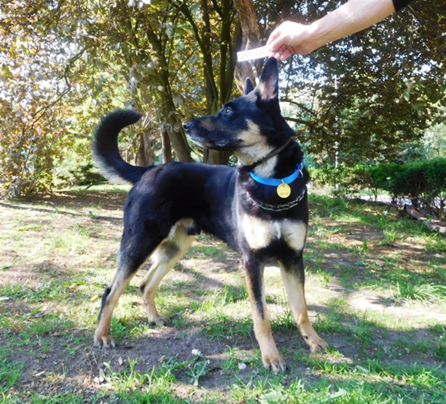 Mieszaniec w typie owczarka niemieckiego: czarny, podpalany. Tyle że o sylwetce bardziej sportowej niż jego rasowy odpowiednik.