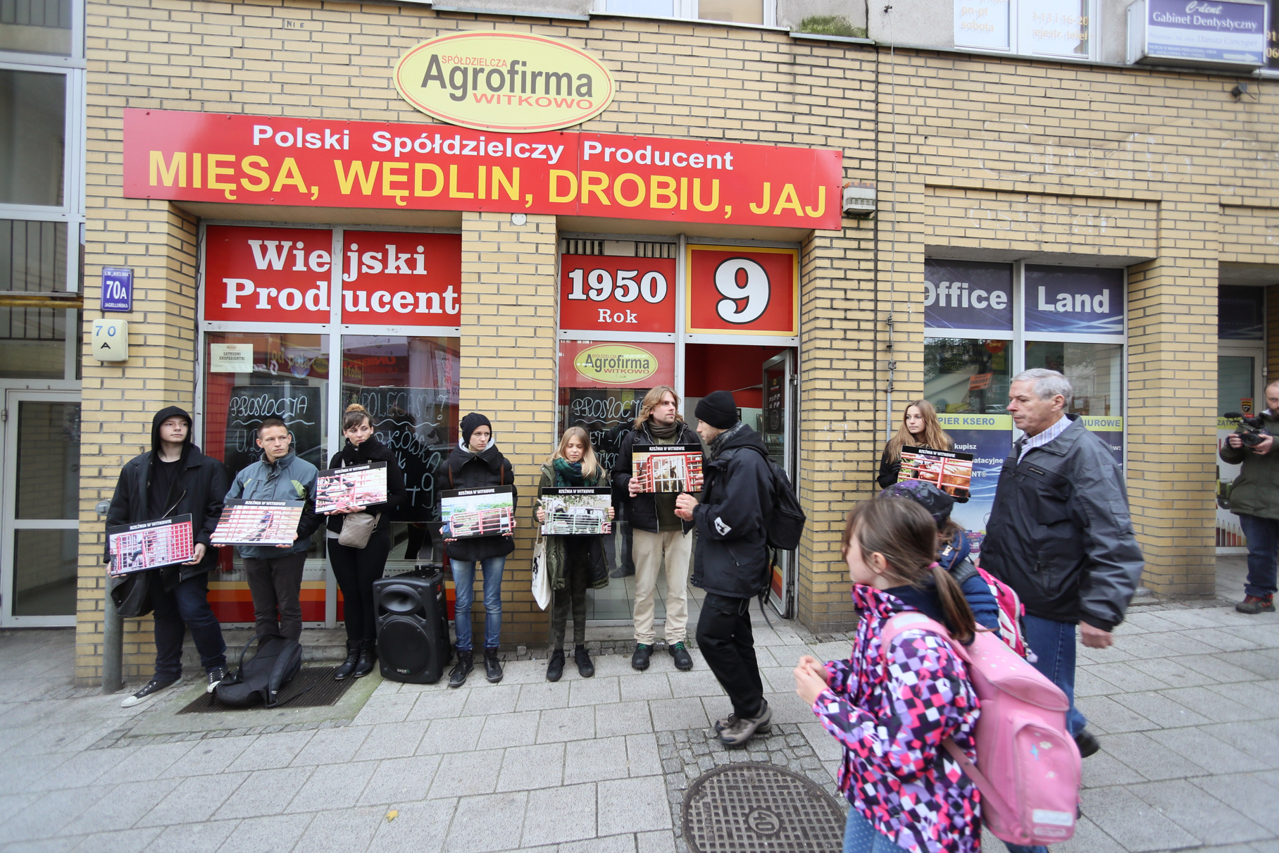Działacze stanęli szpalerem przy ul. Jagiellońskiej (nr 70A), u zbiegu z al. Bohaterów Warszawy, trzymając w rękach zdjęcia z rzeźni w Witkowie. Z zatrzymanymi w kadrach obrazami ludzi, kopiących i bijących drągami przerażone, bezbronne, stłoczone i wzajemnie tratujące się zwierzęta: w tychże "naszych braci mniejszych" ostatniej drodze.