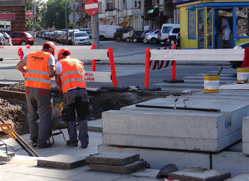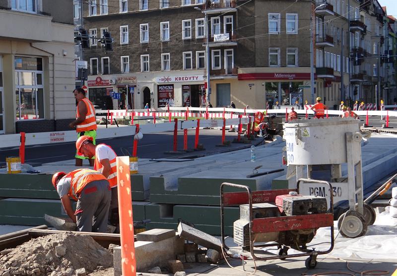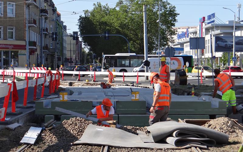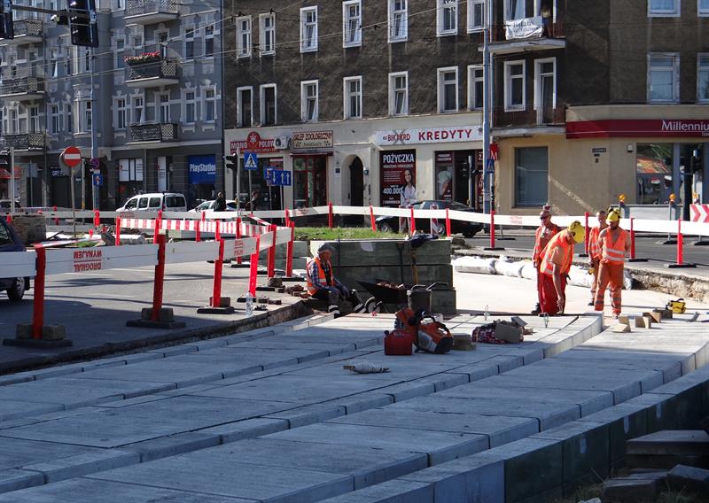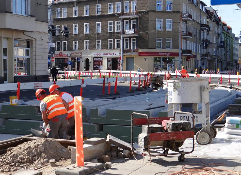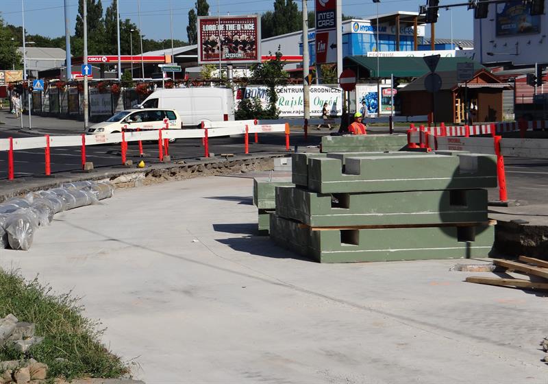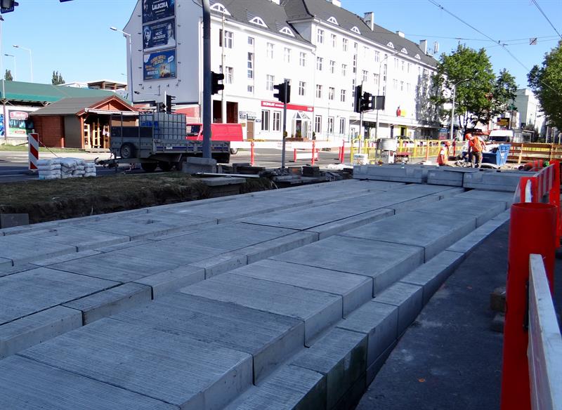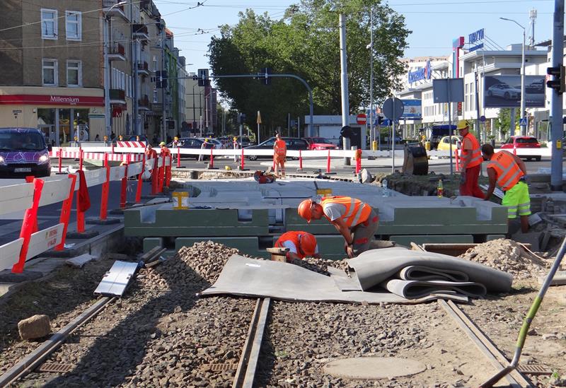 Po rozbiórce starych odcinków torów, niwelacji terenu i wylaniu betonowej podbudowy po nowe szyny u zbiegu al. Bohaterów Warszawy z ul. Bolesława Krzywoustego trwają teraz prace przy układaniu specjalnych profilowanych bloków, będących elementami nowego podtorza na łuku jezdni. Do złudzenia przypomina to układanie konstrukcji z klocków lego. Na plac przebudowy zwożone są kolejne materiały, w tym maty wibroizolacyjne sylomer do wytłumiania drgań i hałasu przejeżdżających po torach tramwajów. Koszt robót zleconych spółce Niwa Szczecin to 2 757 370 zł brutto. Powinny one zakończyć się do 31 sierpnia. ©℗