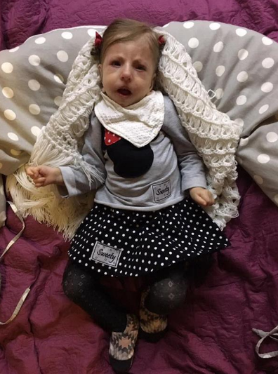 Hania ma dziś dwa lata i siedem miesięcy, waży 10 kg, wygląda na roczne dziecko. Nie ma z nią kontaktu. Nigdy nie będzie samodzielnie chodziła ani siedziała. Ma wzmożone napięcie mięśniowe, co powoduje przykurcze w kończynach, wymaga nieustannej rehabilitacji. Cierpi na padaczkę lekooporną, każdy atak uszkadza mózg. Ma obustronny refluks pęcherzowo-moczowodowy IV stopnia. Co oznacza, że mocz cofa jej się do nerek. Przeszła wiele zakażeń w układzie moczowym, z bakterią oporną prawie na wszystkie antybiotyki, oraz dwie urosepsy. Ma za sobą ciężkie zapalenia płuc i oskrzeli.